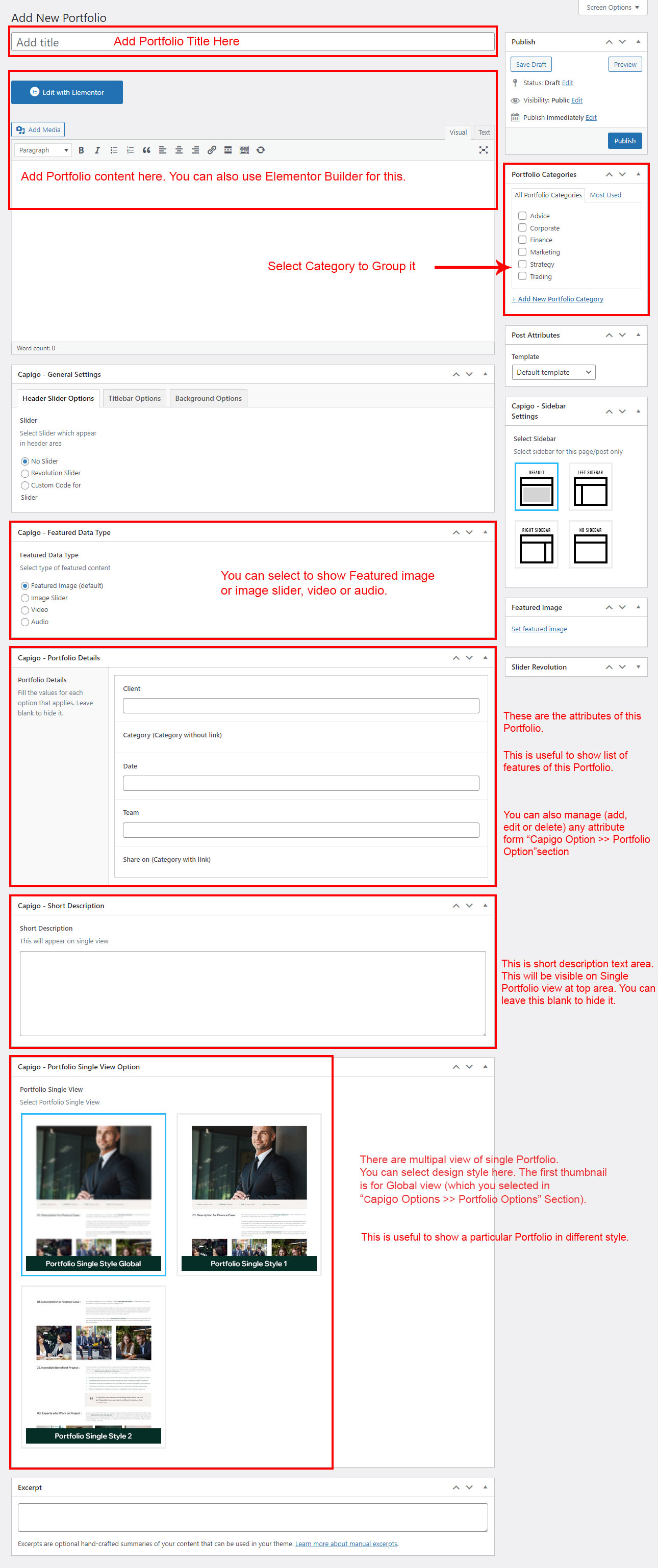 If you already done demo content setup than you can edit existing portfolio and check how we added data so you can understand each option perfectly.