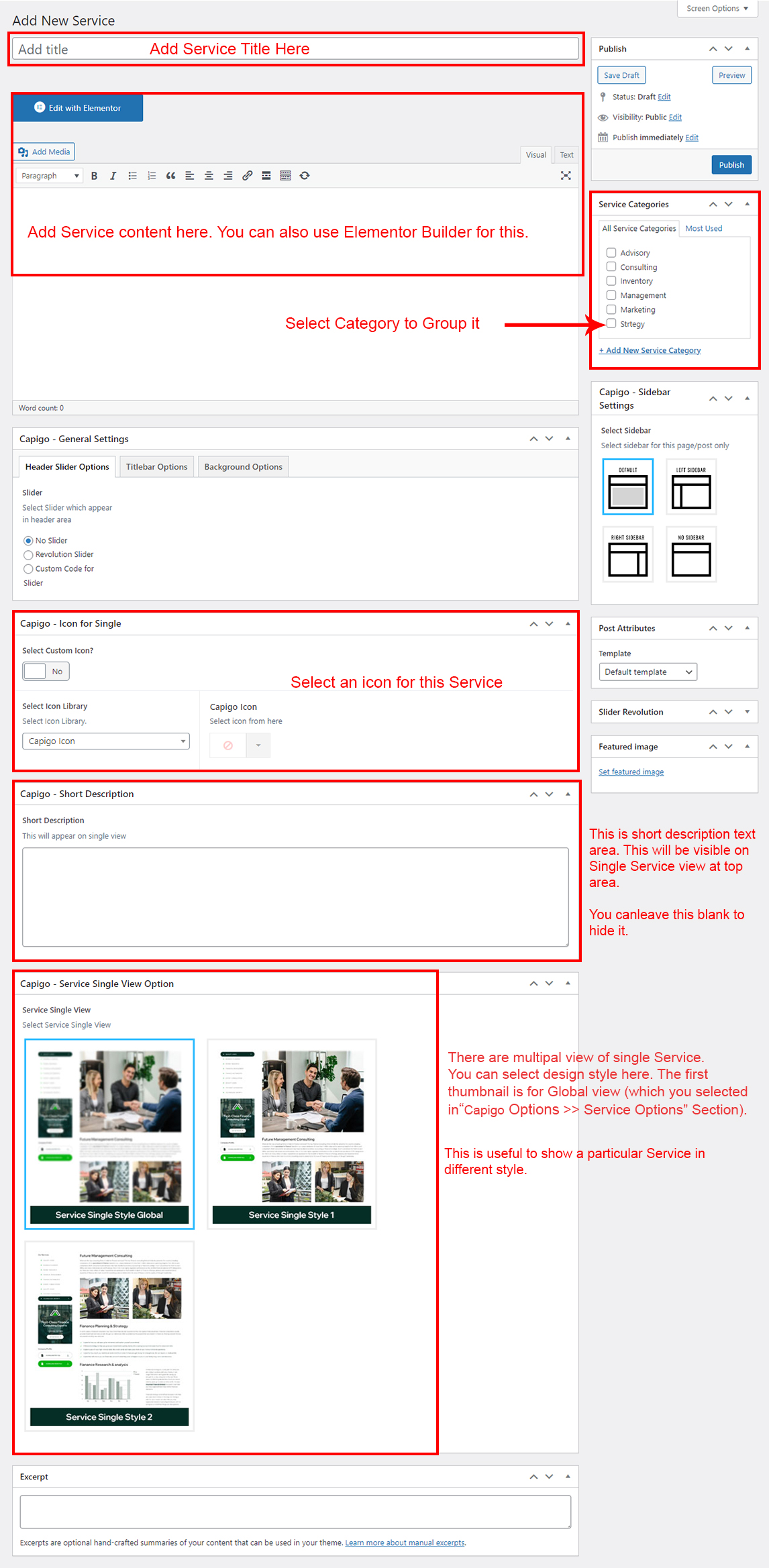 If you already done demo content setup than you can edit existing service and check how we added data so you can understand each option perfectly.
