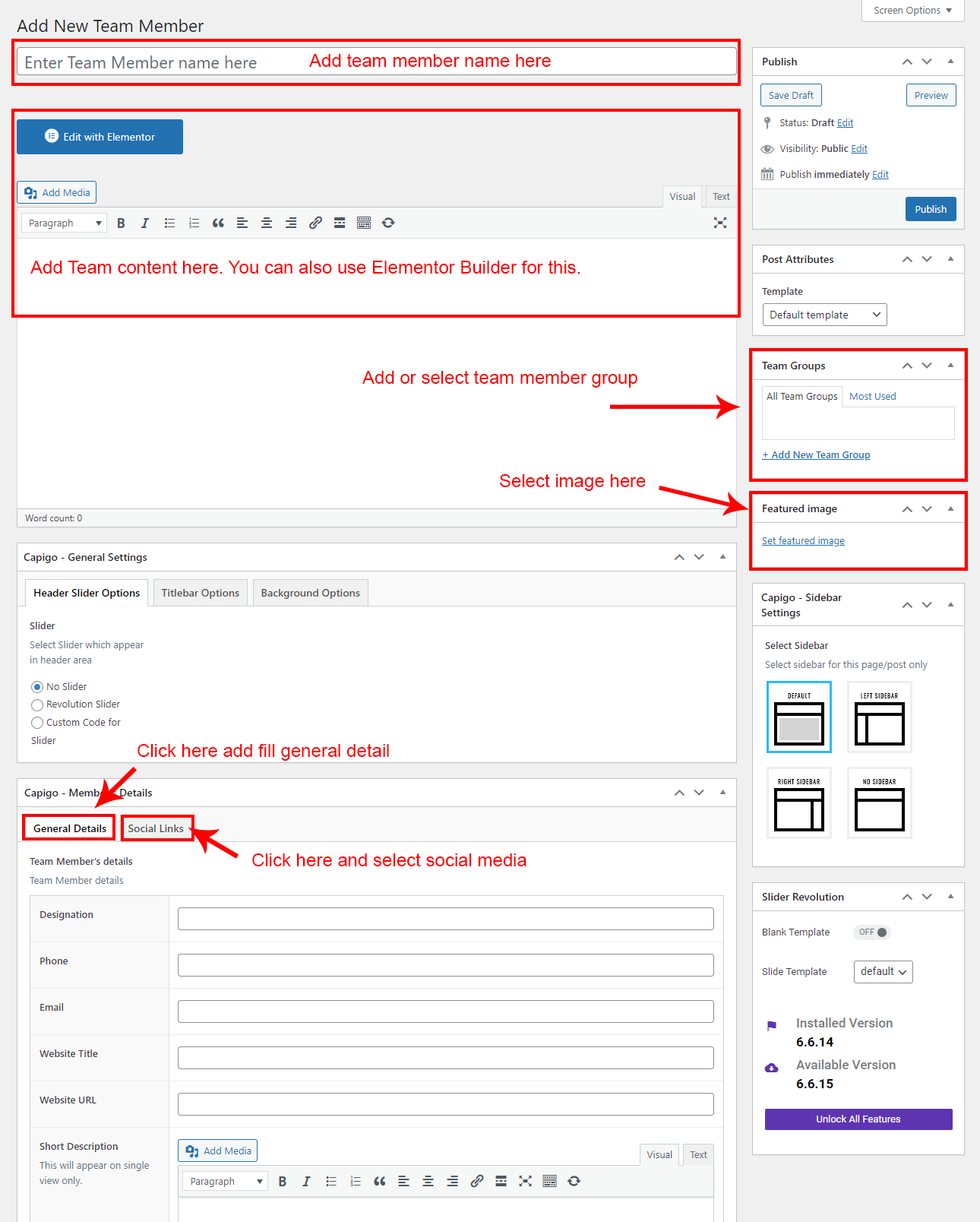 If you already done demo content setup than you can edit existing Team and check how we added data so you can understand each option perfectly.