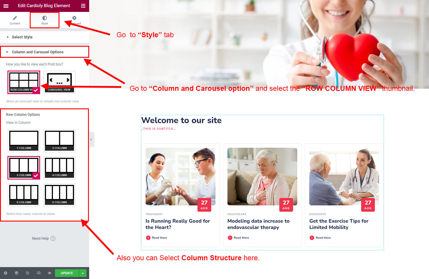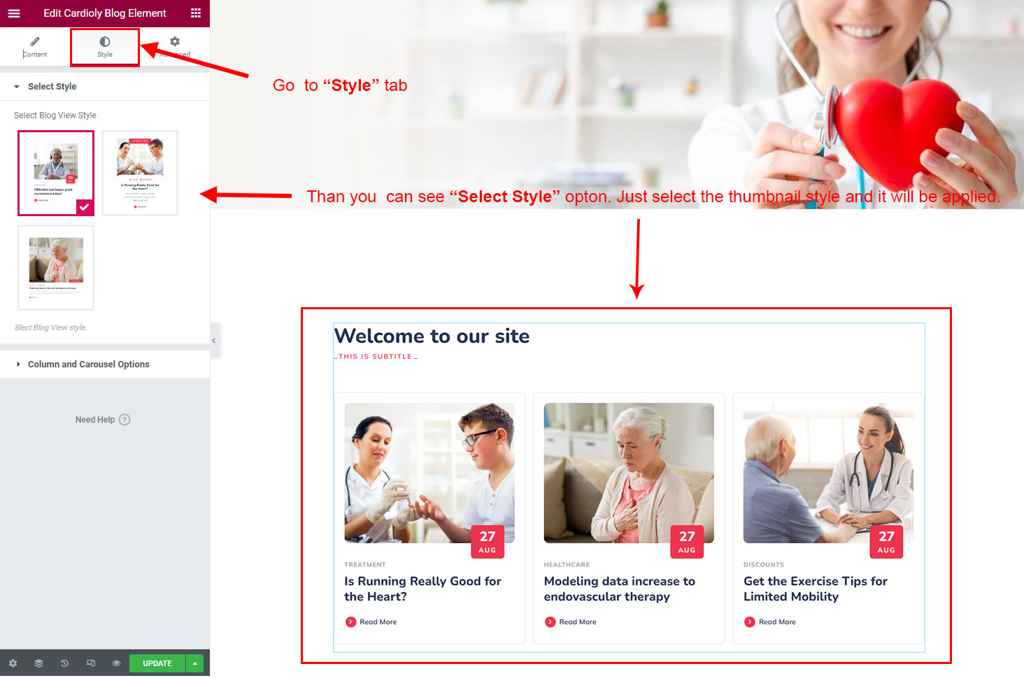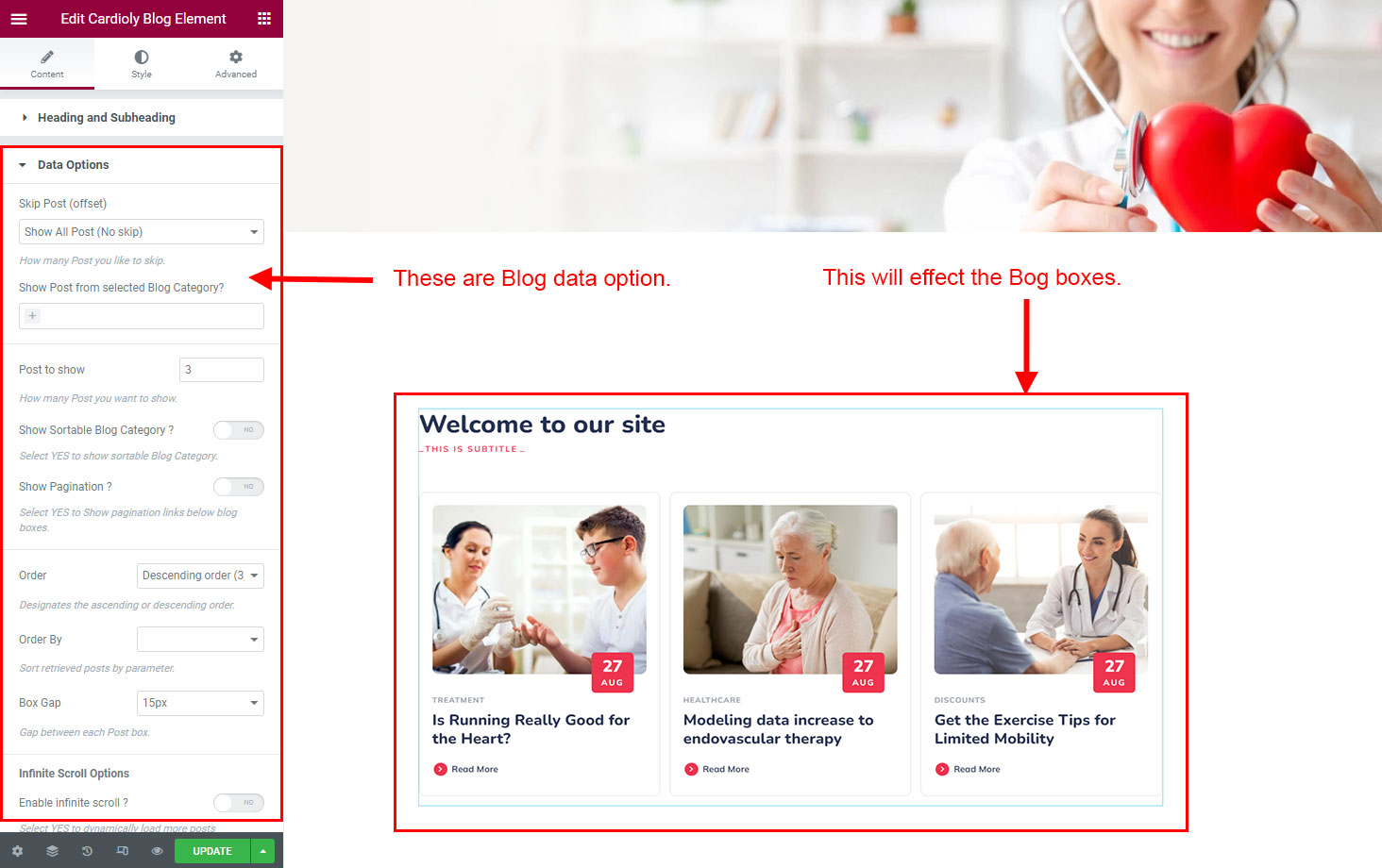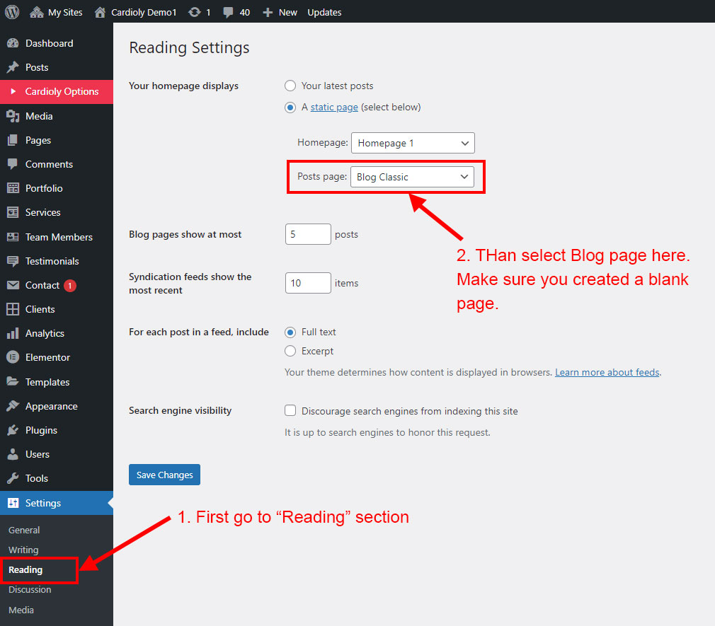 We created a Blog Element in Elementor Page Builder which you can use to show post on any page you want. Just drag and drop the Cardioly Blog Element on any page and the post list will appear.