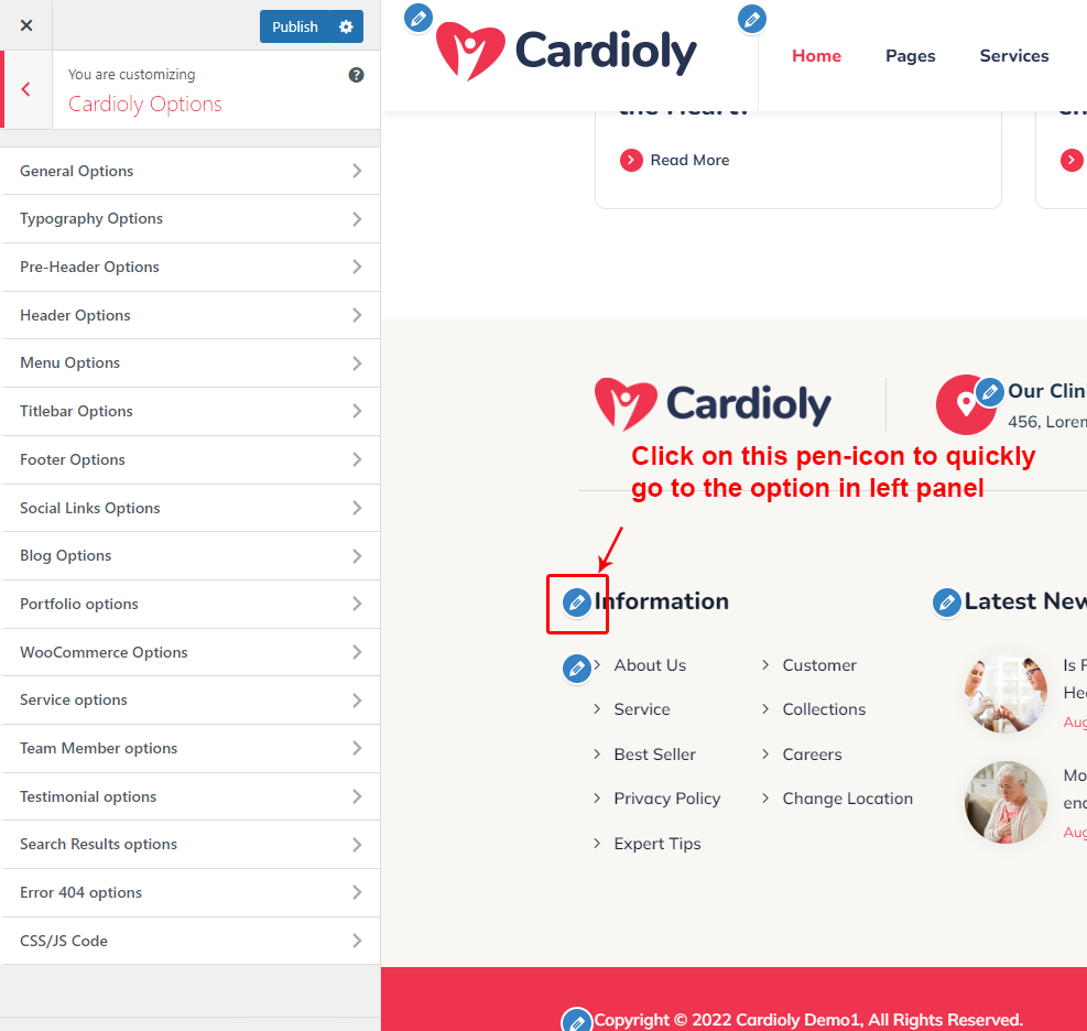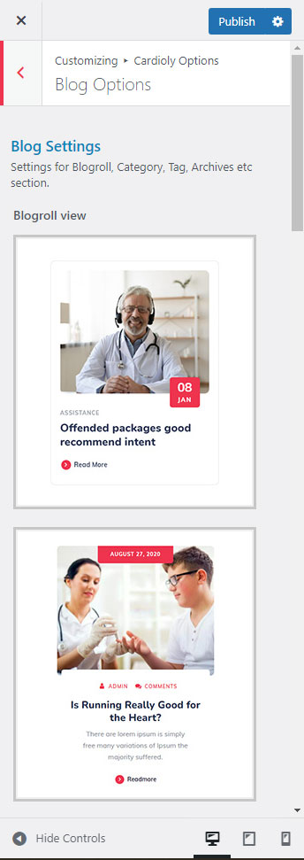 There are different sections in Cardioly theme. Here you will find name of each section name so you can find their options easily. You can customize each sections from Cardioly Options easily.