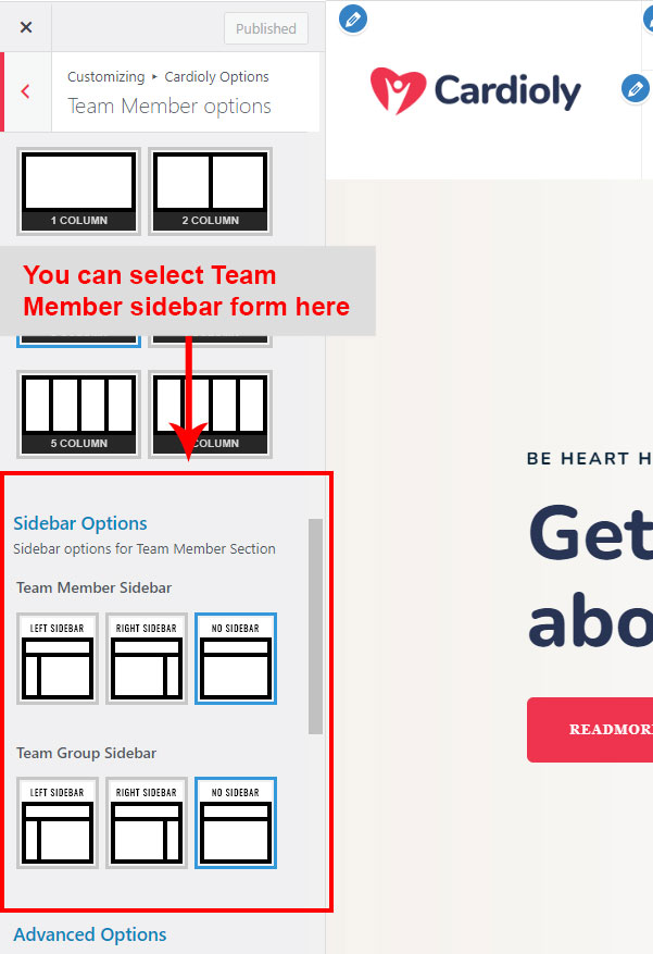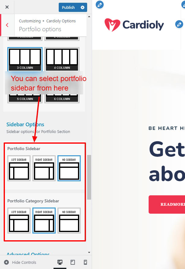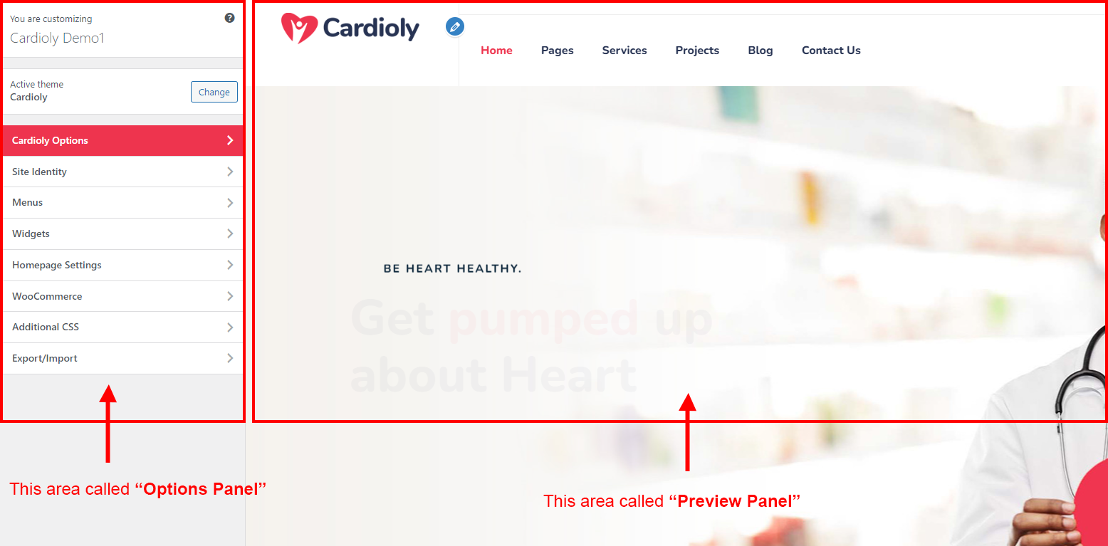 After clicking on the Cardioly Options panel you will redirected to the Customize section. It has two sections. Left area called "Options Panel" and the right area called "Preview panel". See screenshot given below: