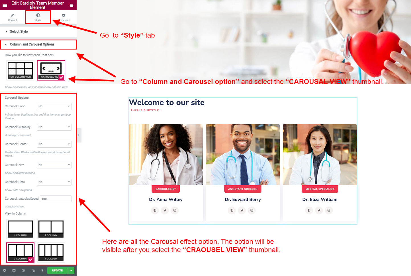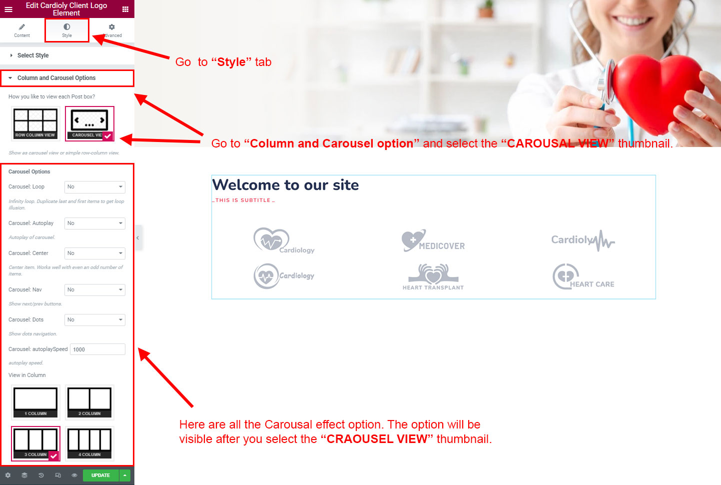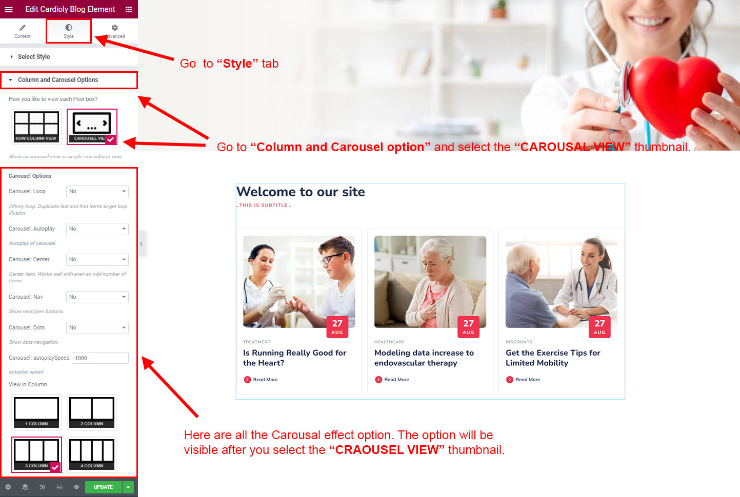CAROSUEL VIEW: The Carousel view will be animated sliding view. There are lot's of options for the slideing animatins. Like animation speed, animation column, auto-play on or off, Loop post boxes, show/hide the dot or arrow navigation etc.