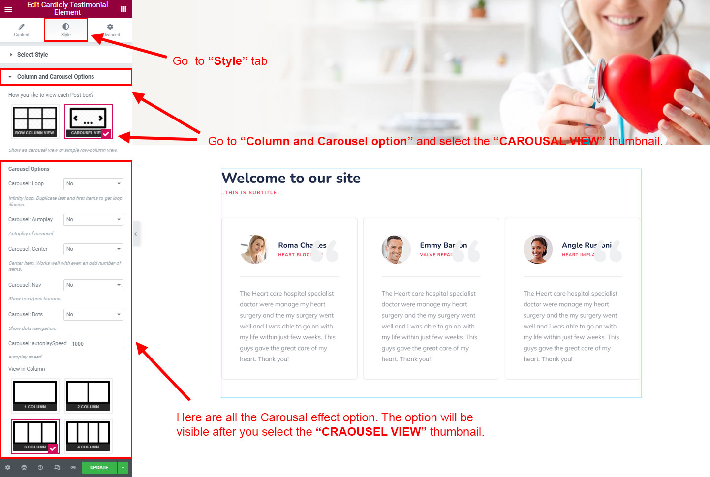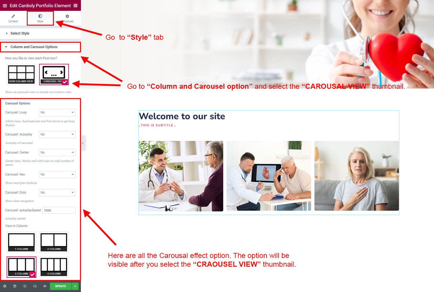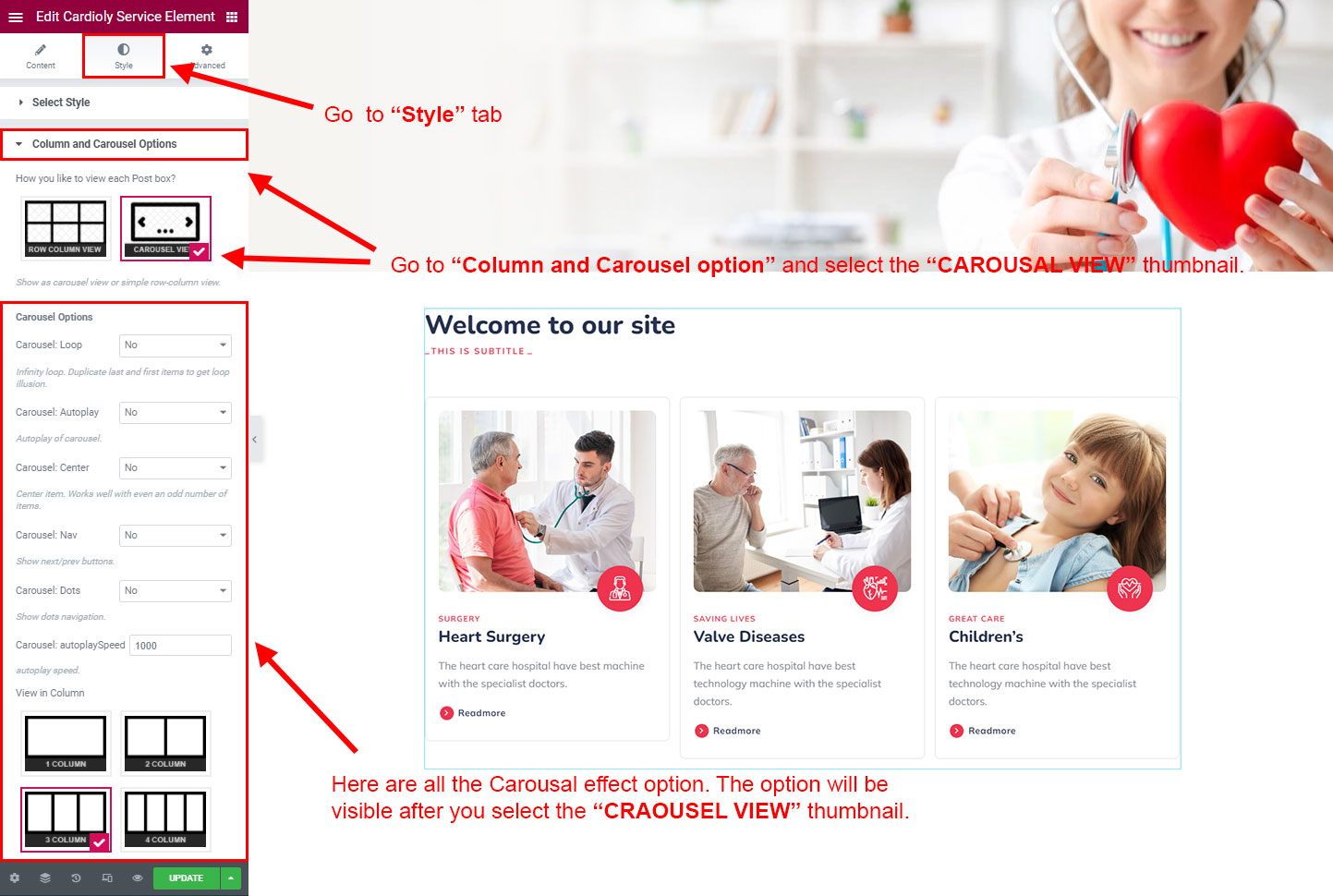 CAROSUEL VIEW: The Carousel view will be animated sliding view. There are lot's of options for the slideing animatins. Like animation speed, animation column, auto-play on or off, Loop post boxes, show/hide the dot or arrow navigation etc.