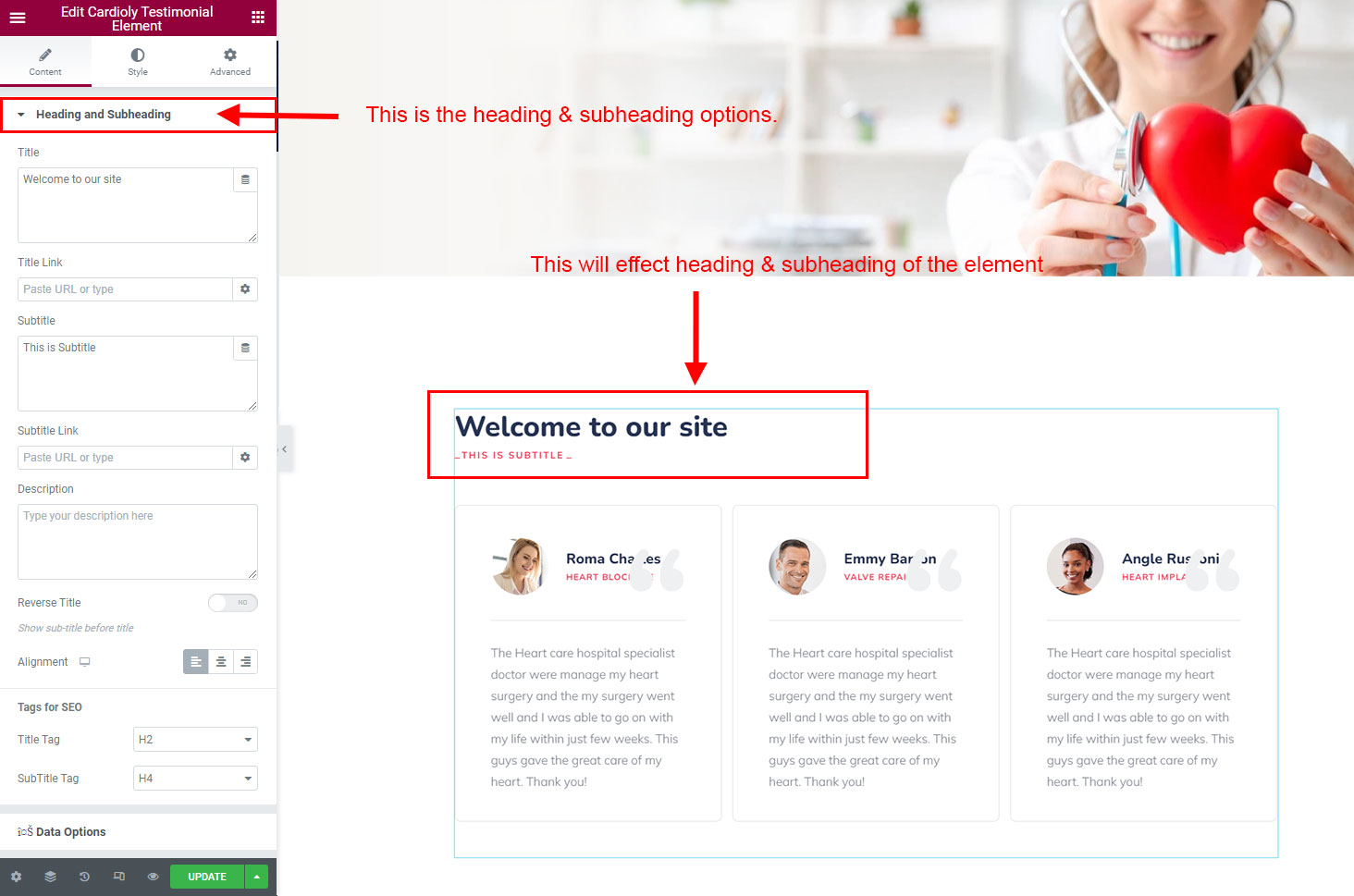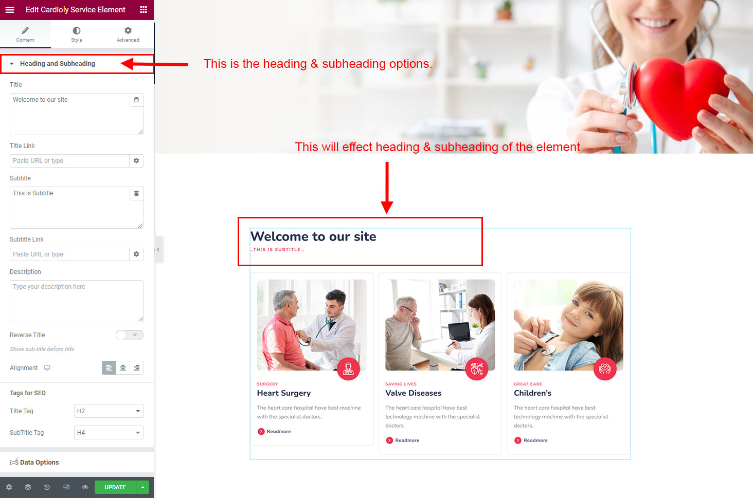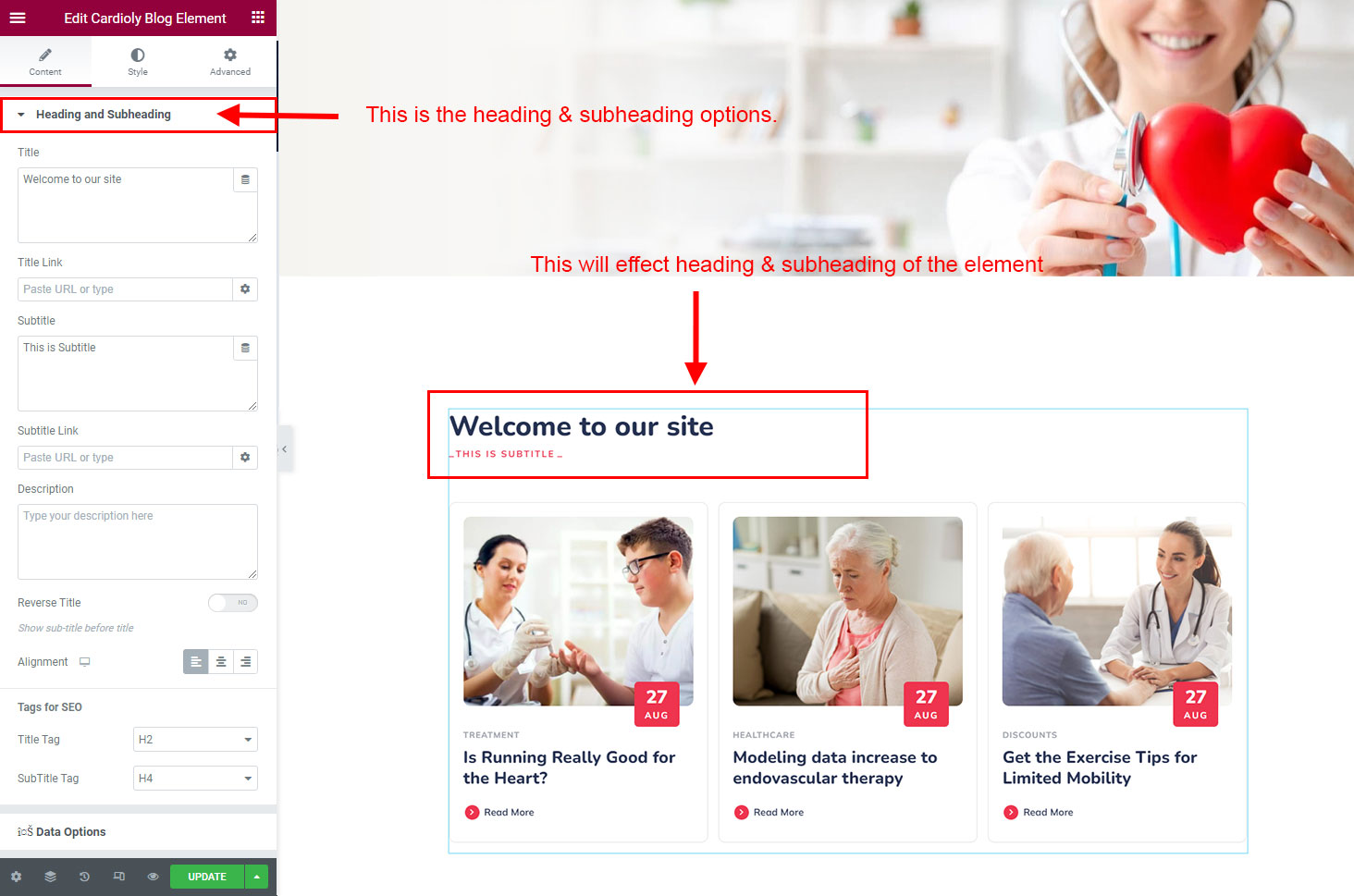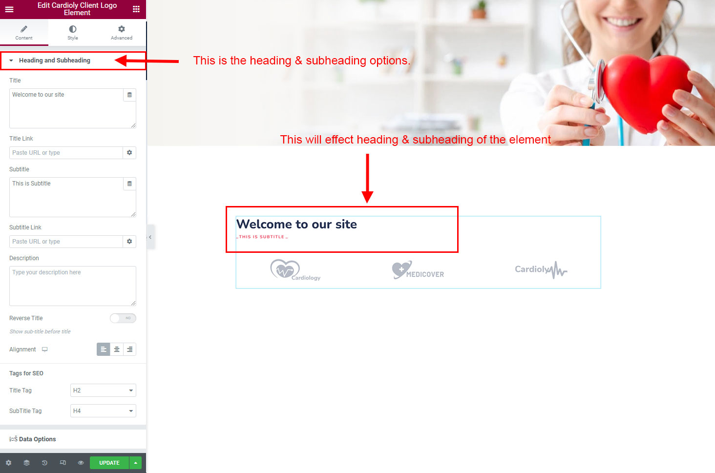 The heading and subheading will appear at top of the element. You can change text, add link to the heading or subheading, change alignment, change tag (for SEO purpose) etc.