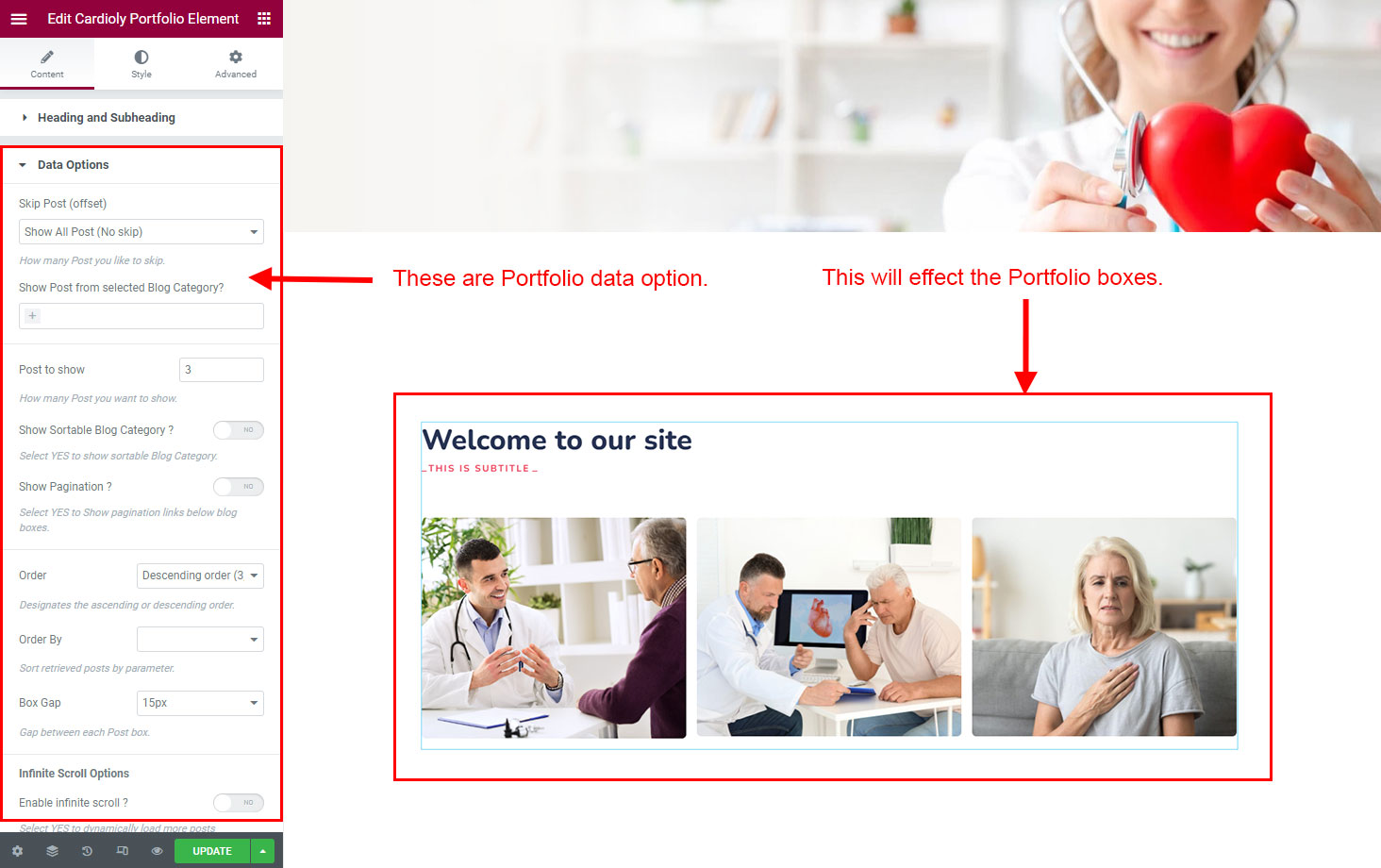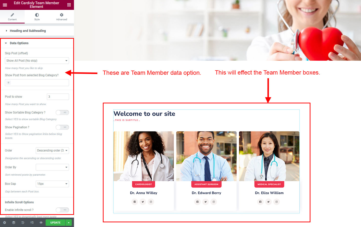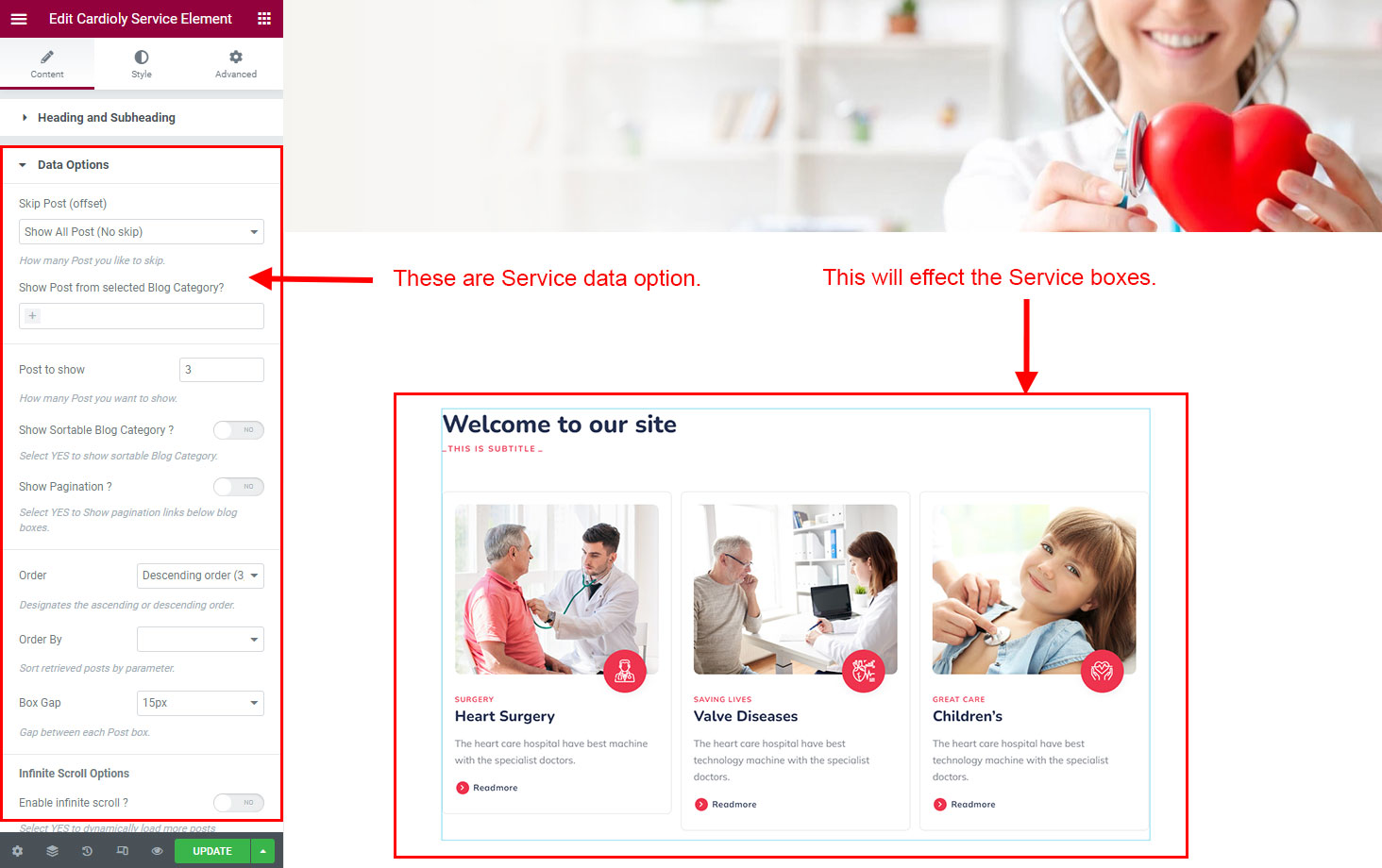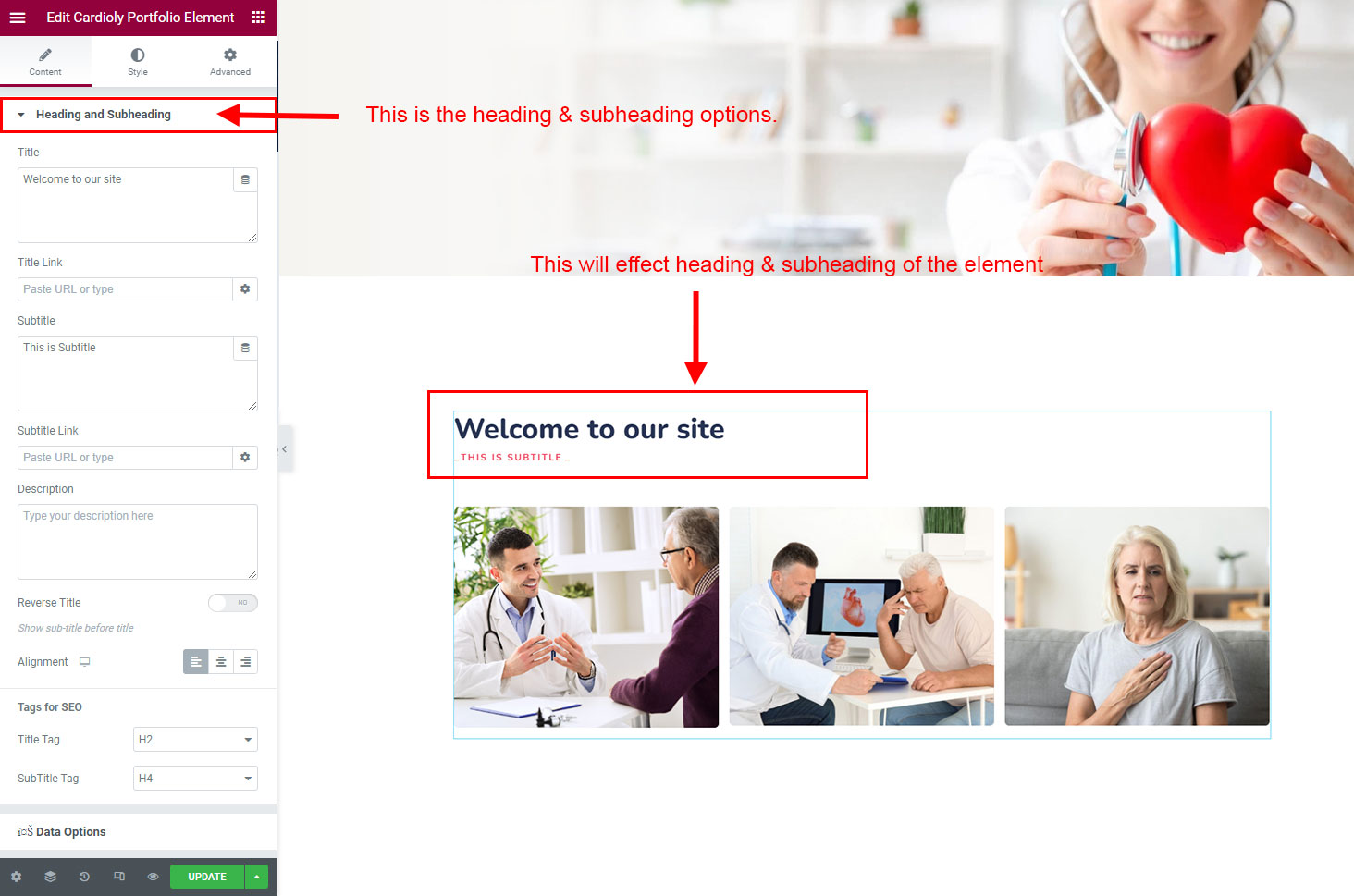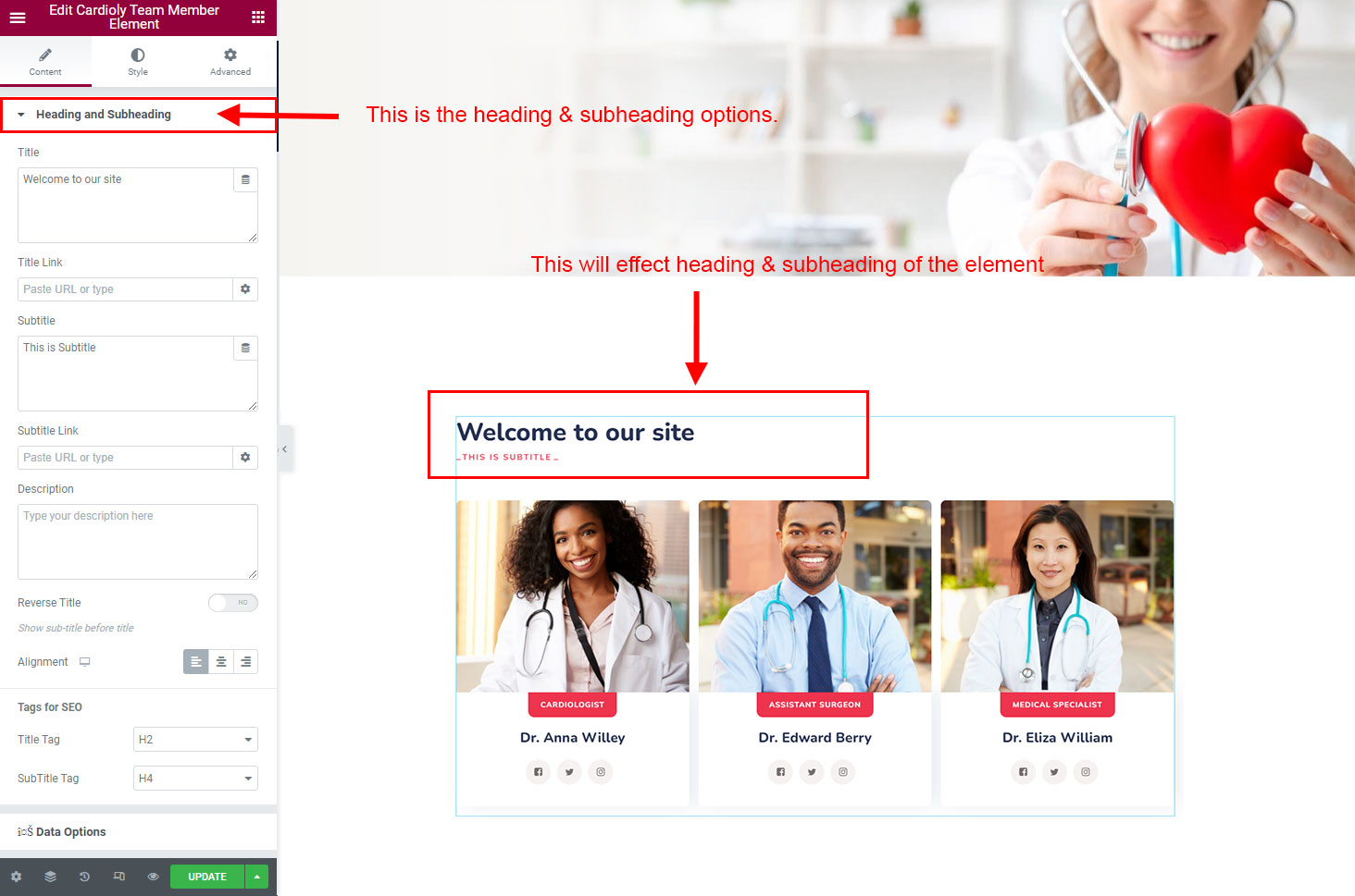 The heading and subheading will appear at top of the element. You can change text, add link to the heading or subheading, change alignment, change tag (for SEO purpose) etc.