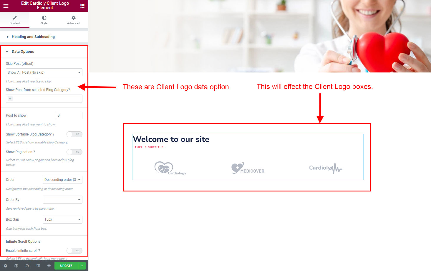 You can select the client-logo options here. Like how many client-logo you like to show, show client-logo from selected group (category), client-logo order etc.