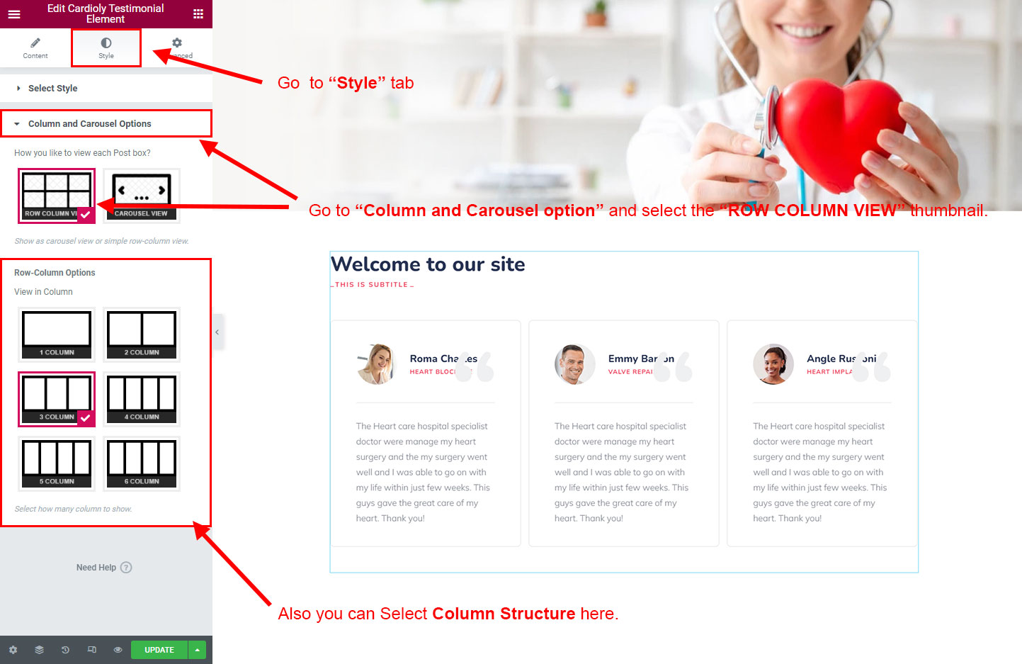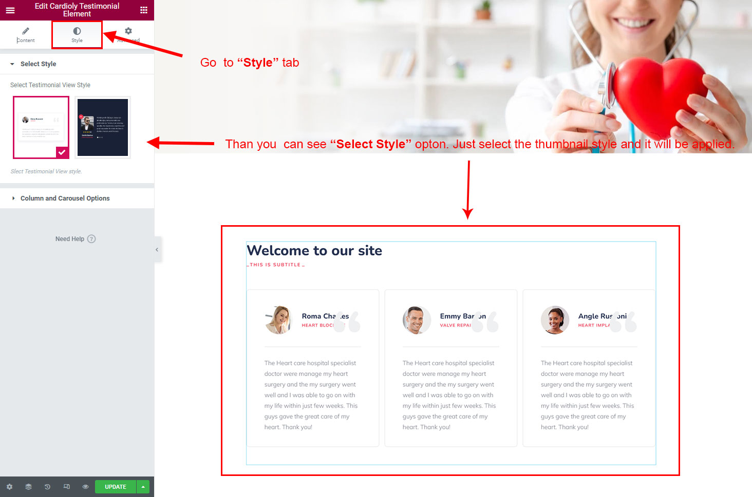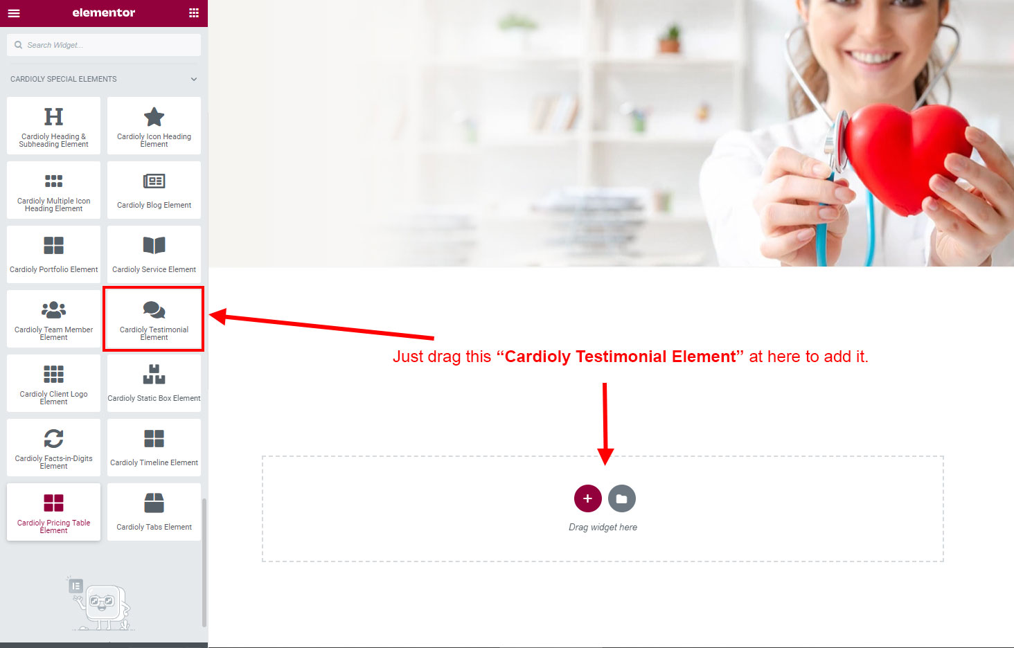 Now we have some Testimonial posts. So we can show all Testimonial on a page. Create a new page and add Cardioly Testimonial Element on a page by dragging it.