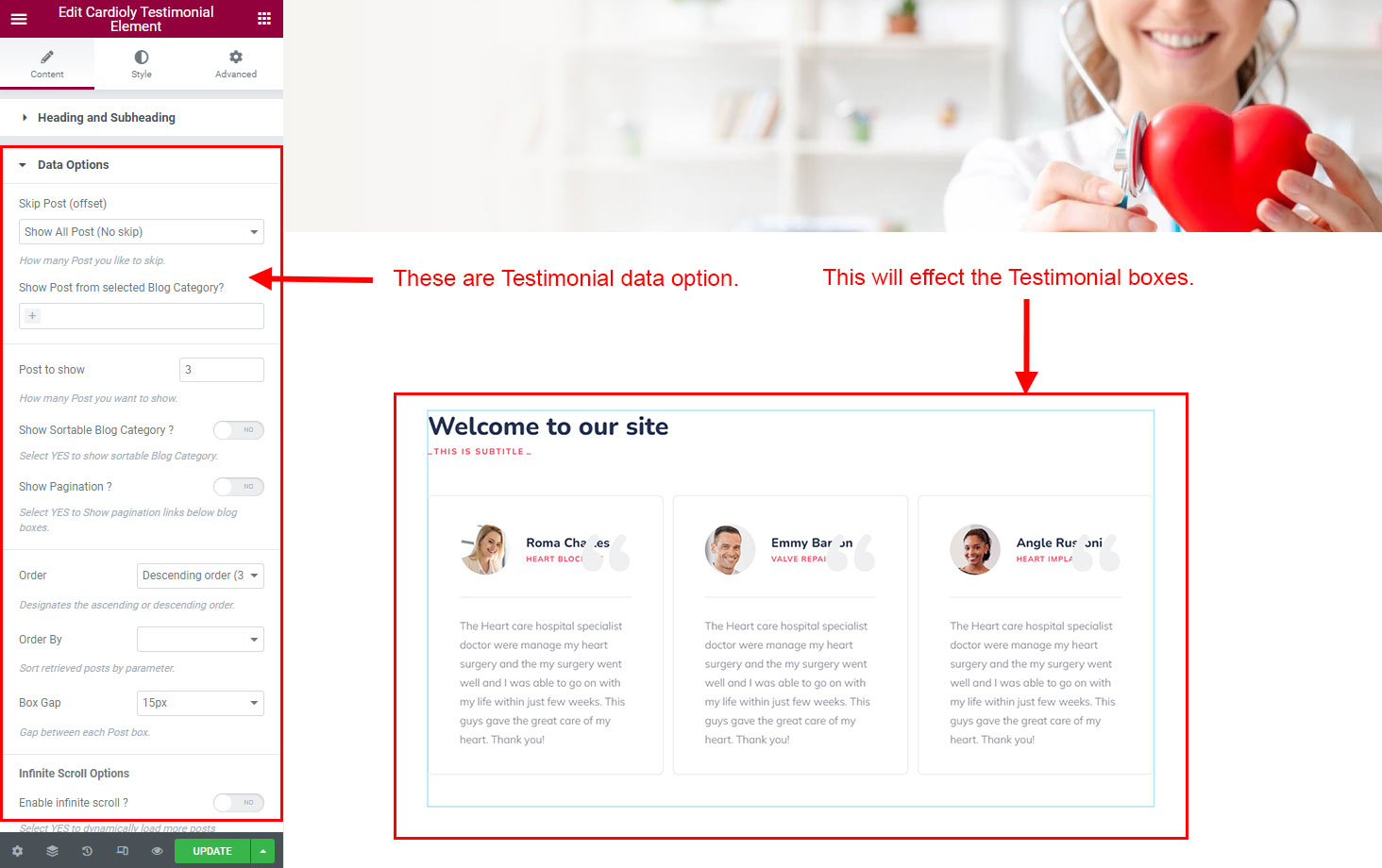 You can select the testimonial options here. Like how many testimonial you like to show, show testimonial from selected group (category), testimonial order etc.