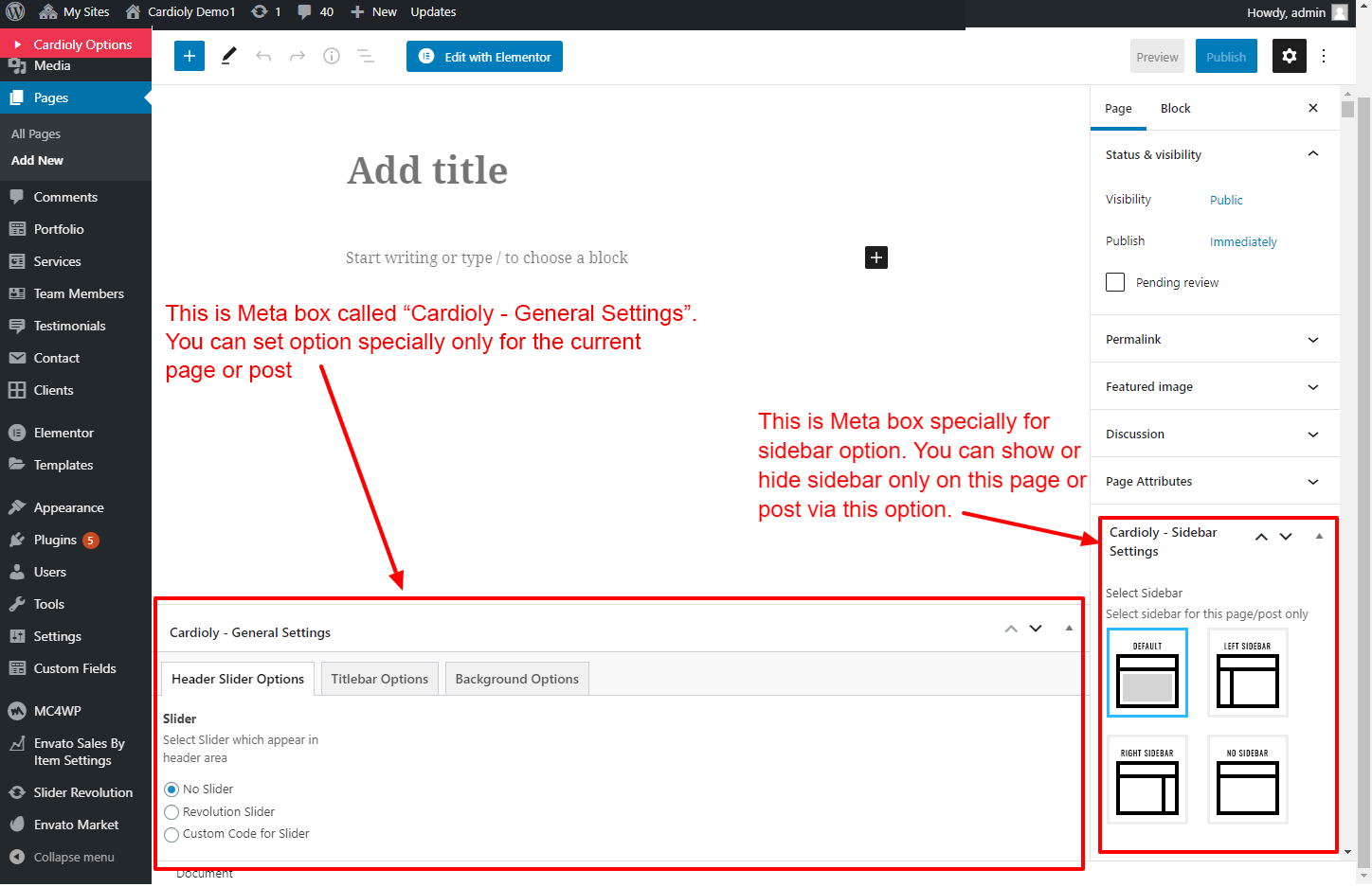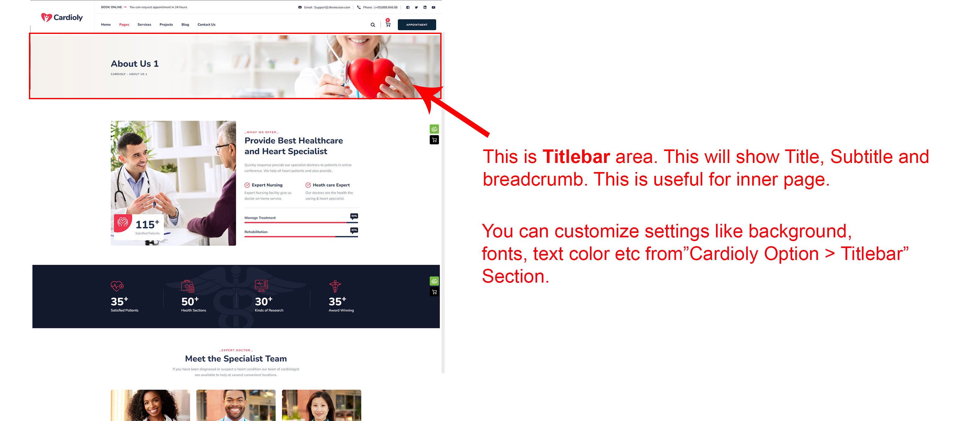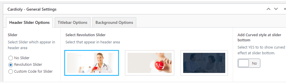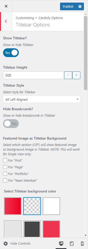This will override the options set under Cardioly Options > Titlebar Settings options. This will help you to set special design the Titlebar on specific page or post.