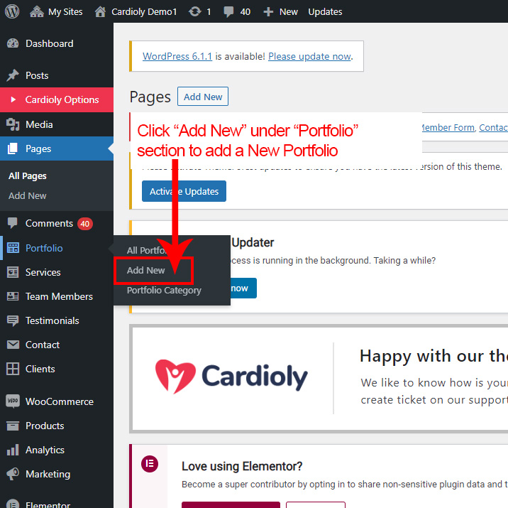 Now we have some Portfolio posts. So we can show all Portfolio on a page. Create a new page and add Cardioly Portfolio Element on a page by dragging it.