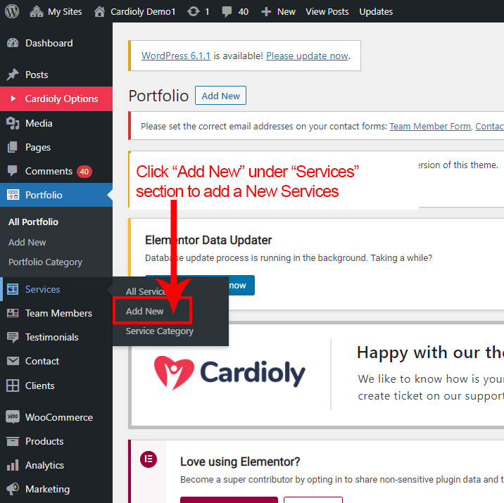 Now we have some Service posts. So we can show all Service on a page. Create a new page and add Cardioly Service Element on a page by dragging it.