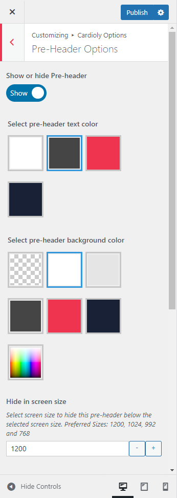 Pre-header section will appear above header area. You can show or hide it globally from Cardioly Options >> Pre-header Settings section.
