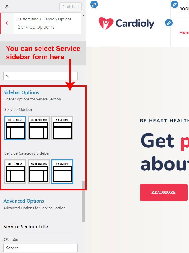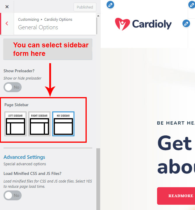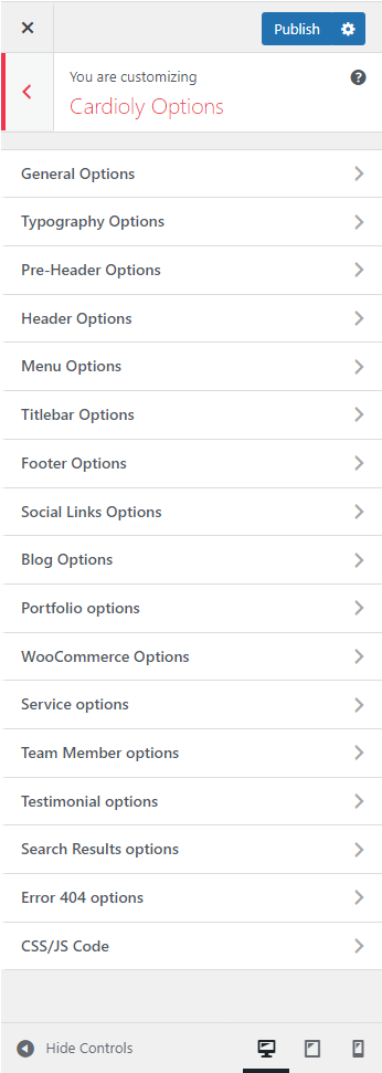 Cardioly Options (Theme Options) panel is created with WordPress' Customize section. We added our own options with WordPress' default options.