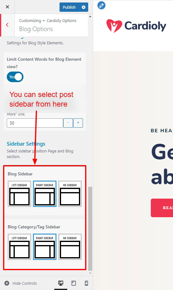 This is specially created sidebar postion (either left or right as selected in Cardioly Options section) that will be shown as sidebar widget on Blog pages like blog list view, single post view, blog category view etc.
