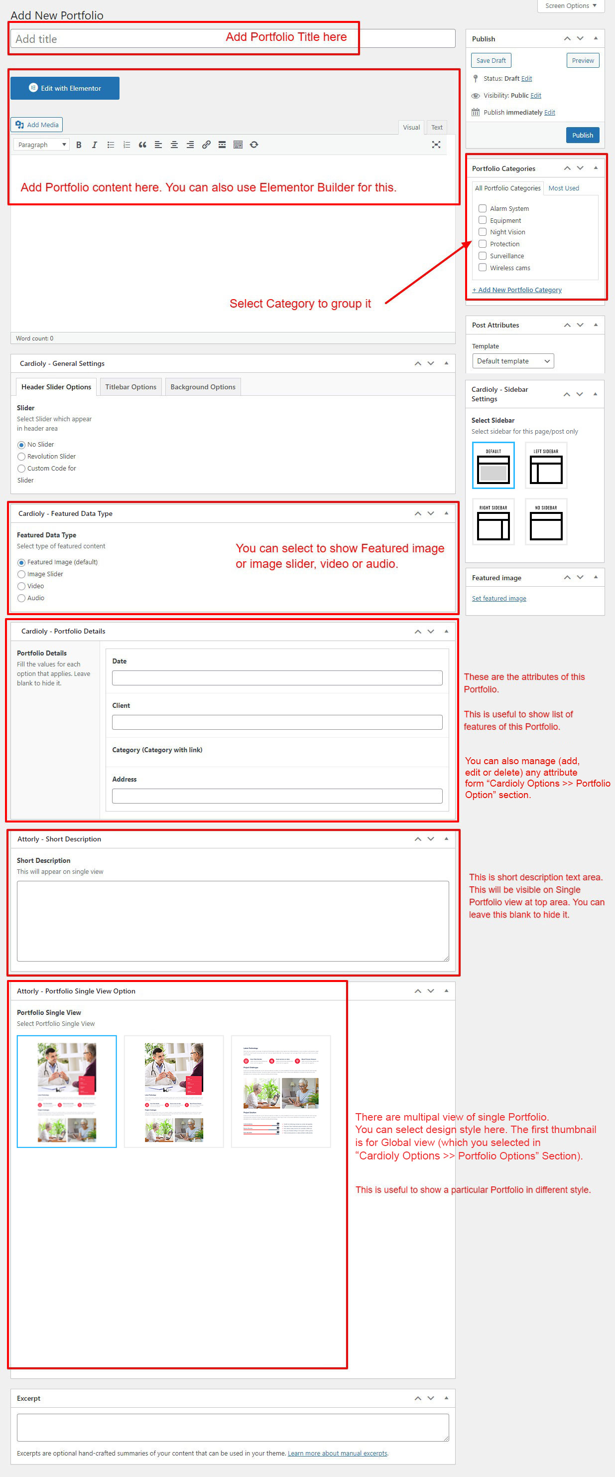If you already done demo content setup than you can edit existing portfolio and check how we added data so you can understand each option perfectly.