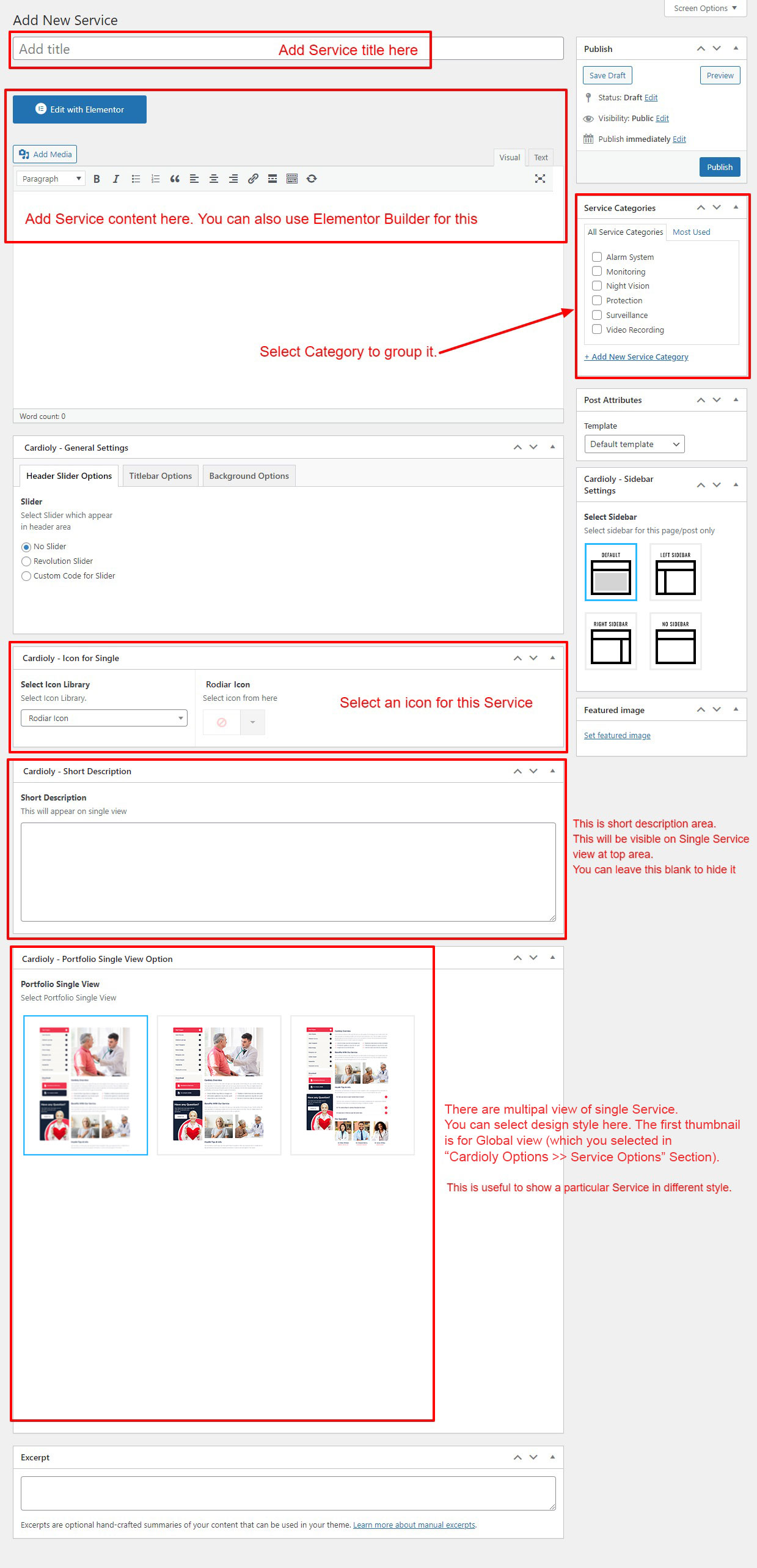 If you already done demo content setup than you can edit existing service and check how we added data so you can understand each option perfectly.