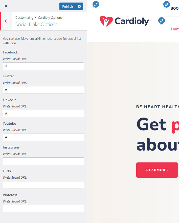 This shortcode specially created to show social links. You can set social links in Cardioly Options >> Social Links Section and write your social links. Than it can be shown using [dsvy-social-links] shortcode.
