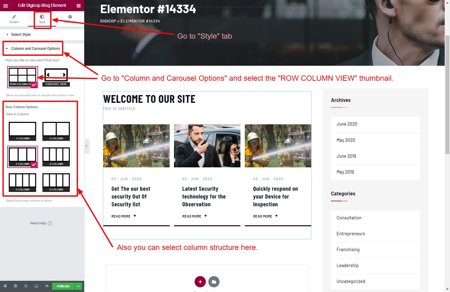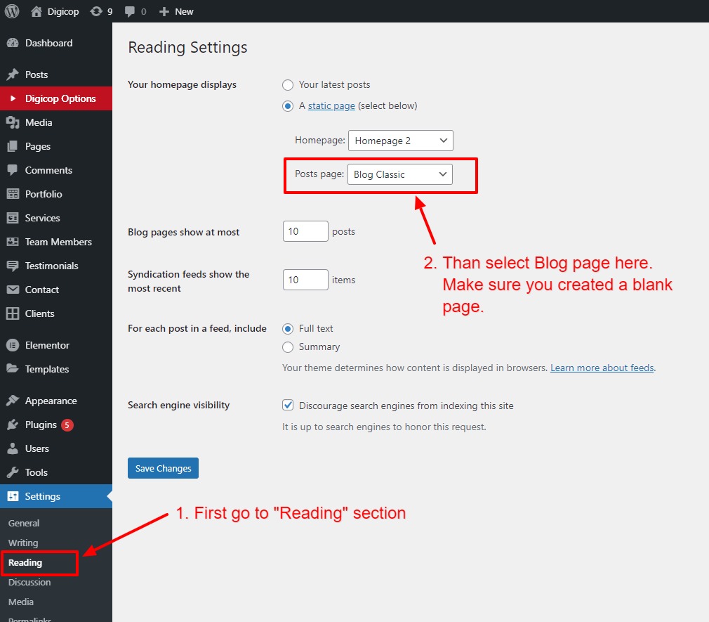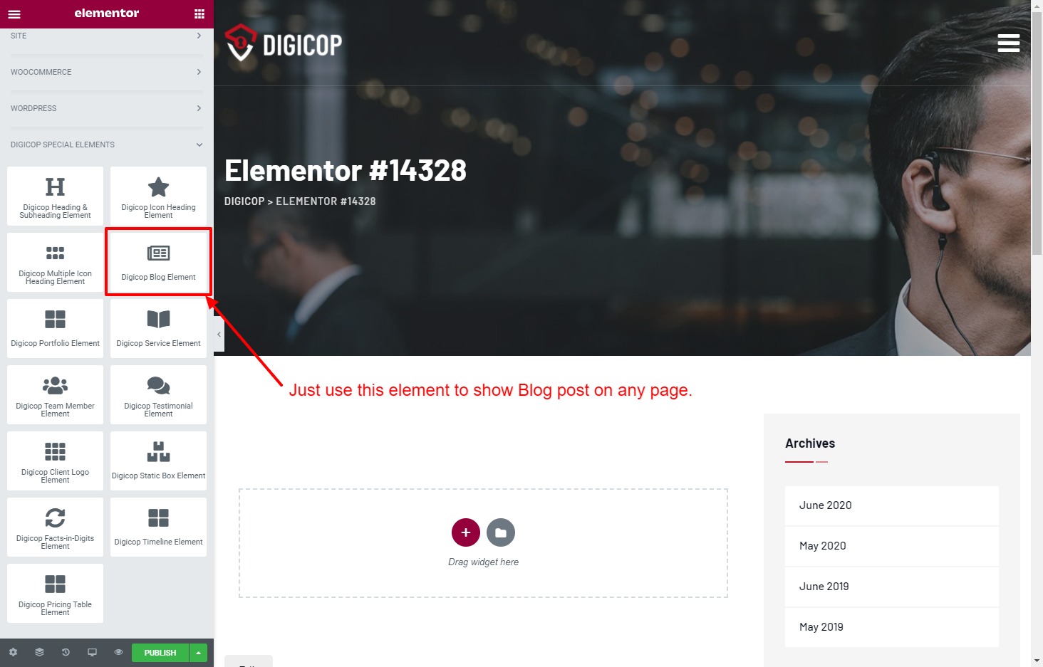 We created a Blog Element in Elementor Page Builder which you can use to show post on any page you want. Just drag and drop the Digicop Blog Element on any page and the post list will appear.