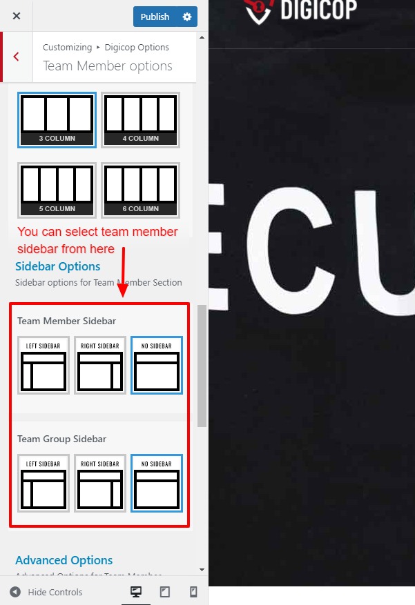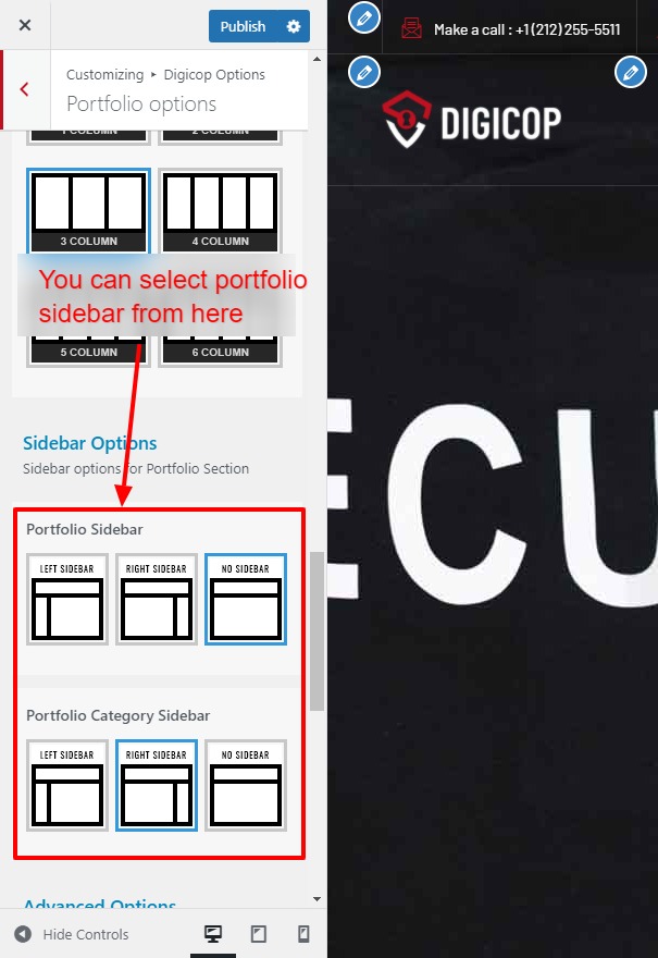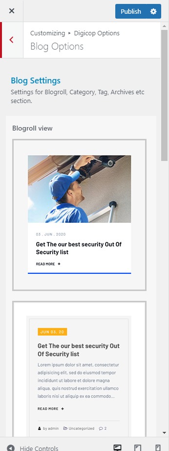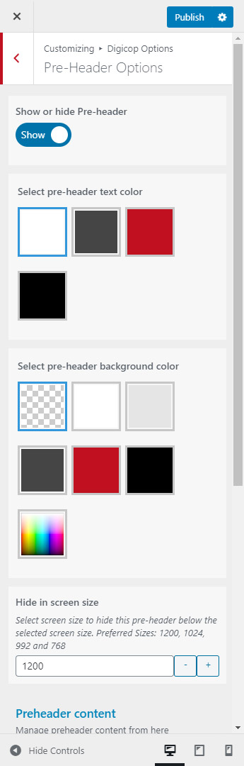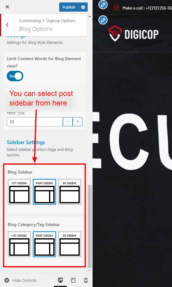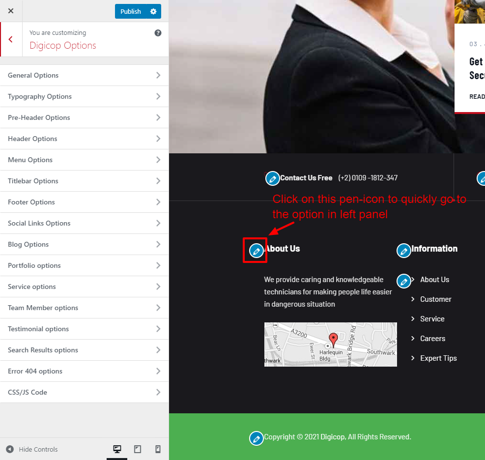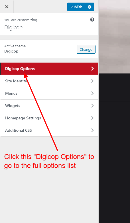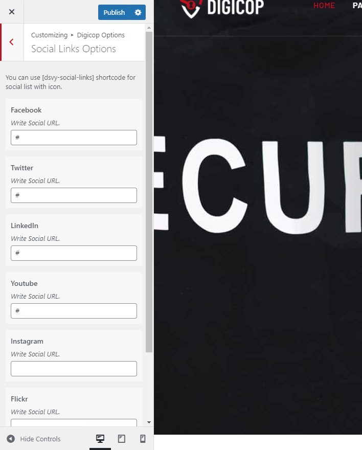 Digicop Options (Theme Options) panel is created with WordPress' Customize section. We added our own options with WordPress' default options.