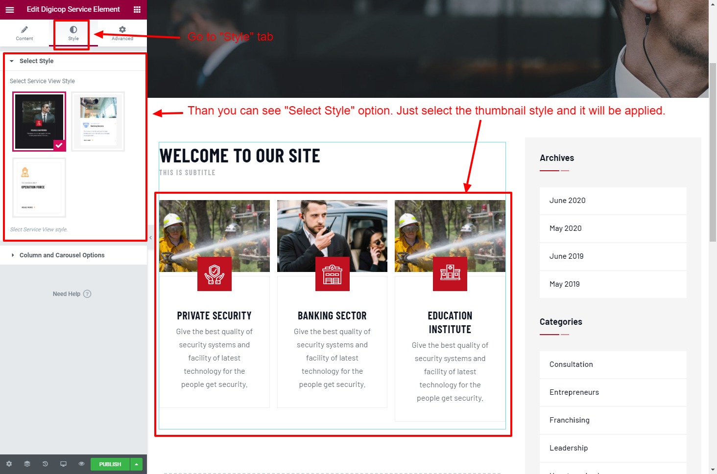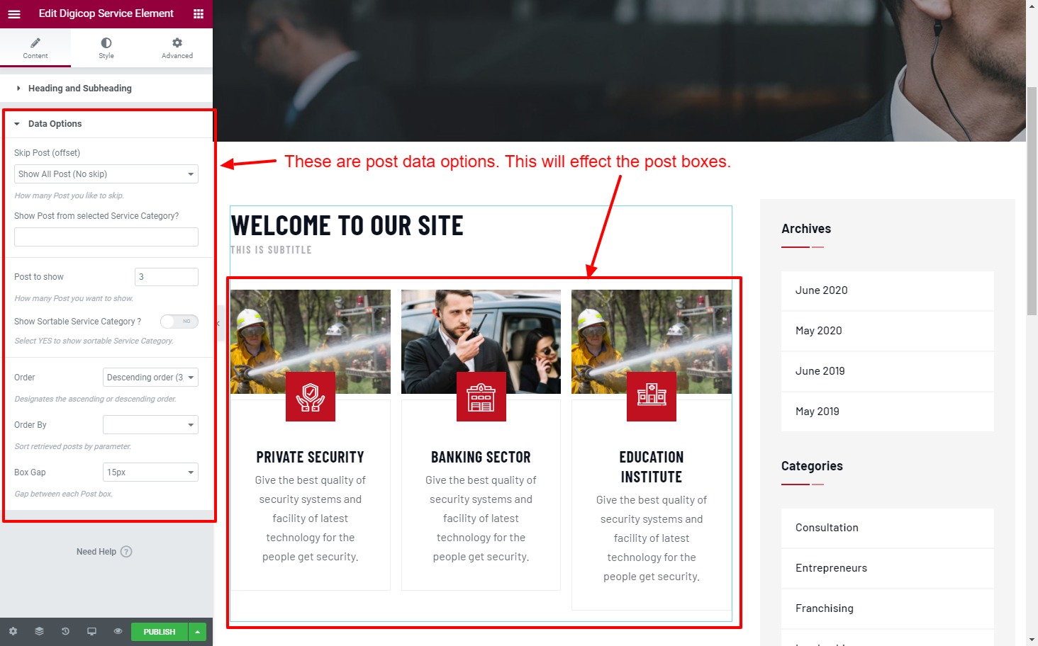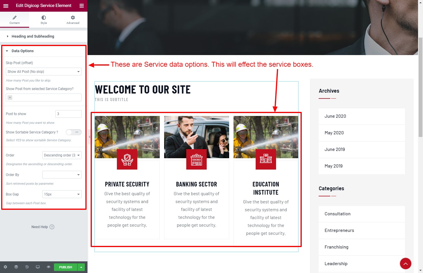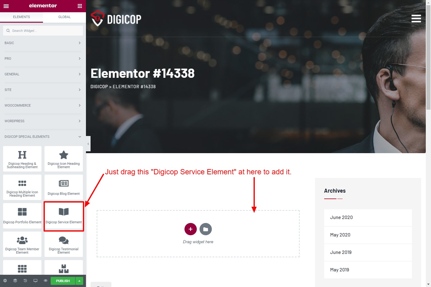 Now we have some Service posts. So we can show all Service on a page. Create a new page and add Digicop Service Element on a page by dragging it.