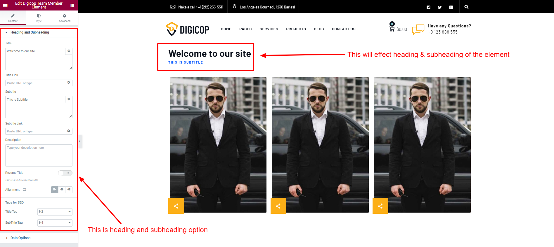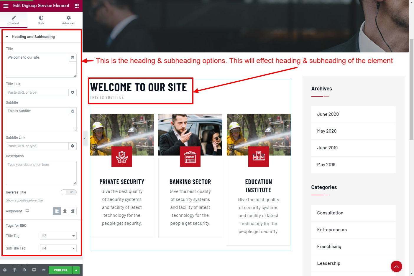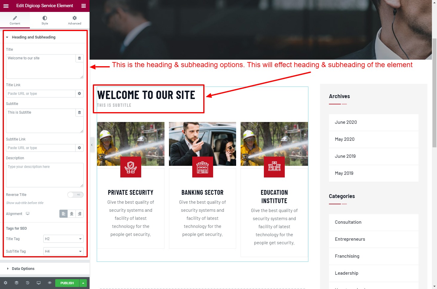 The heading and subheading will appear at top of the element. You can change text, add link to the heading or subheading, change alignment, change tag (for SEO purpose) etc.