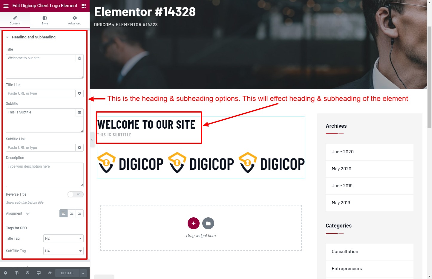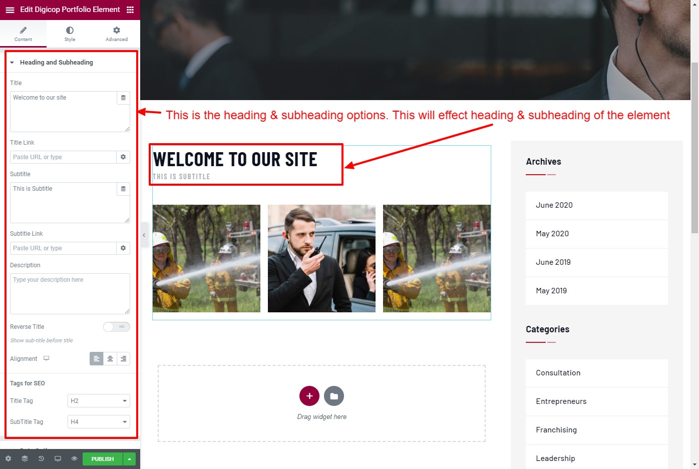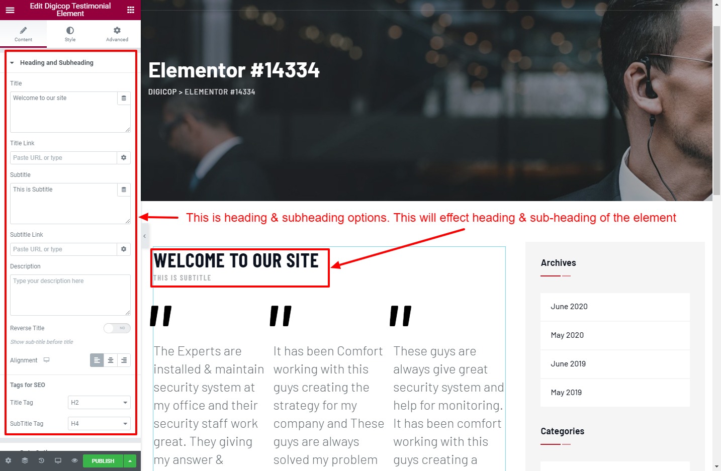 The heading and subheading will appear at top of the element. You can change text, add link to the heading or subheading, change alignment, change tag (for SEO purpose) etc.