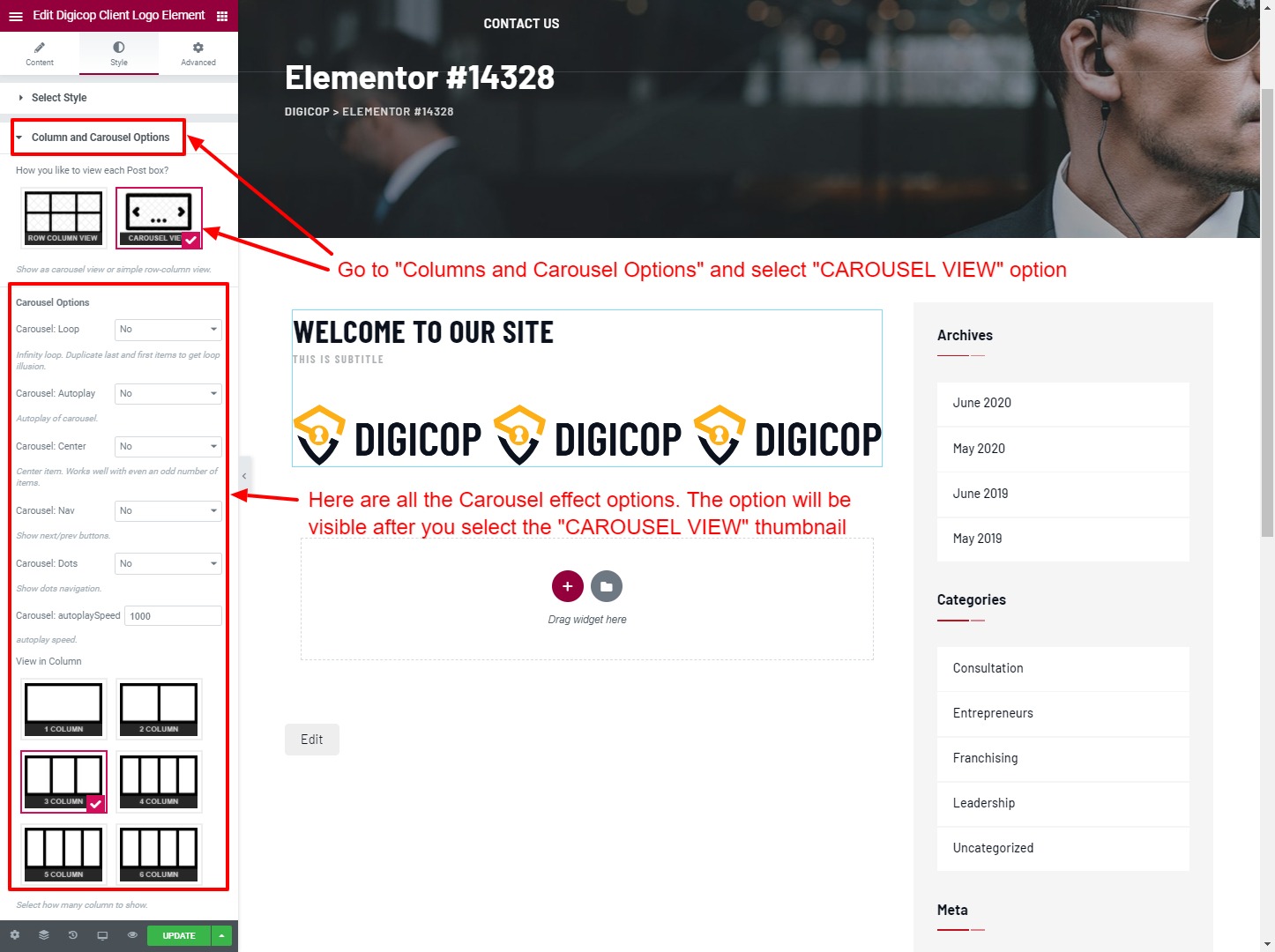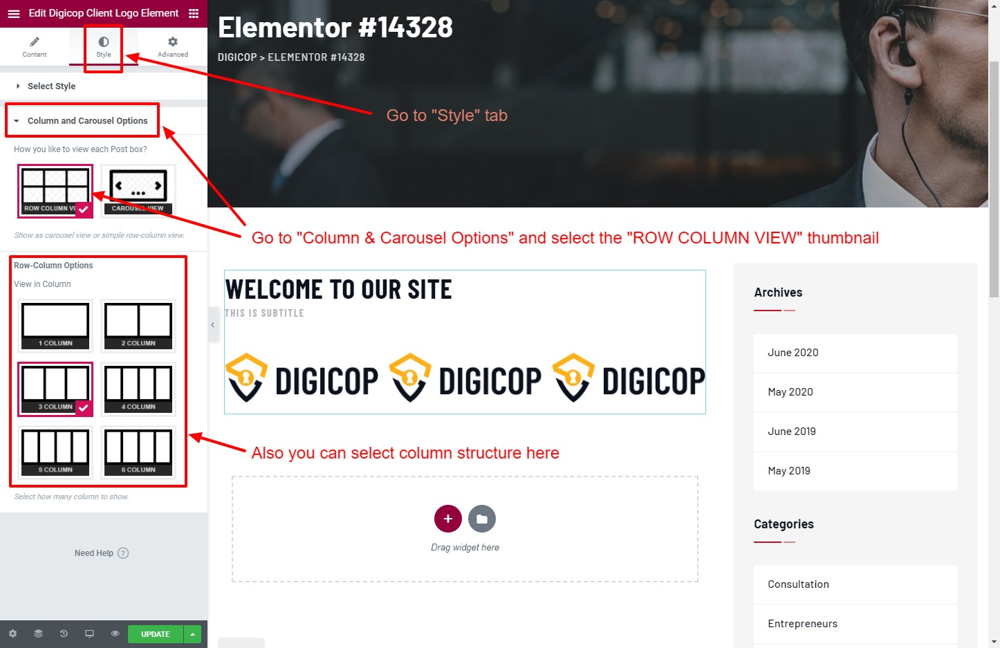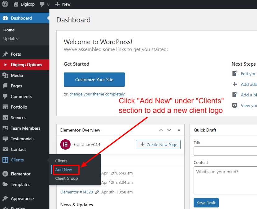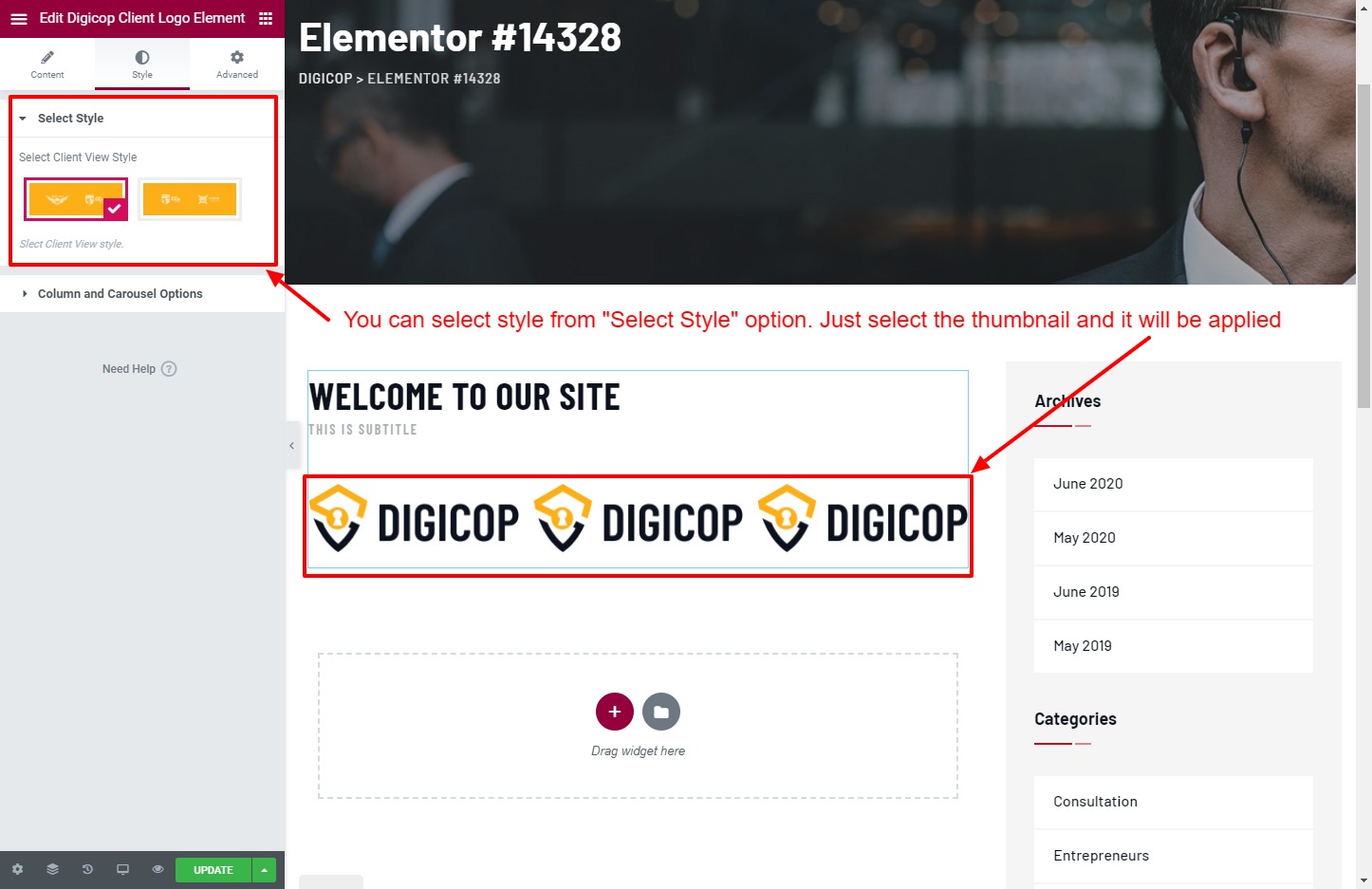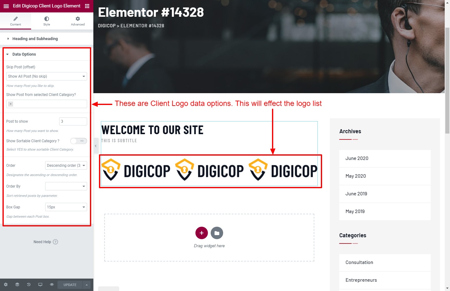 Now we have some Client Logo posts. So we can show all Client Logo on a page. Create a new page and add Digicop Client Logo Element on a page by dragging it.