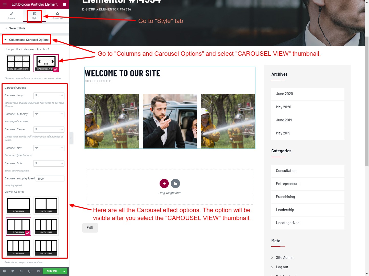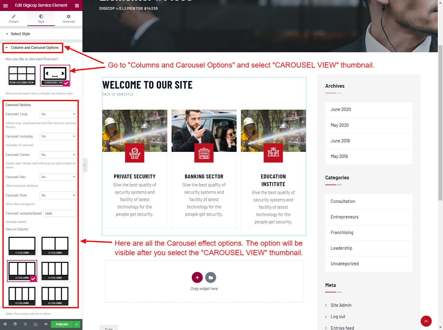 CAROSUEL VIEW: The Carousel view will be animated sliding view. There are lot's of options for the slideing animatins. Like animation speed, animation column, auto-play on or off, Loop post boxes, show/hide the dot or arrow navigation etc.
