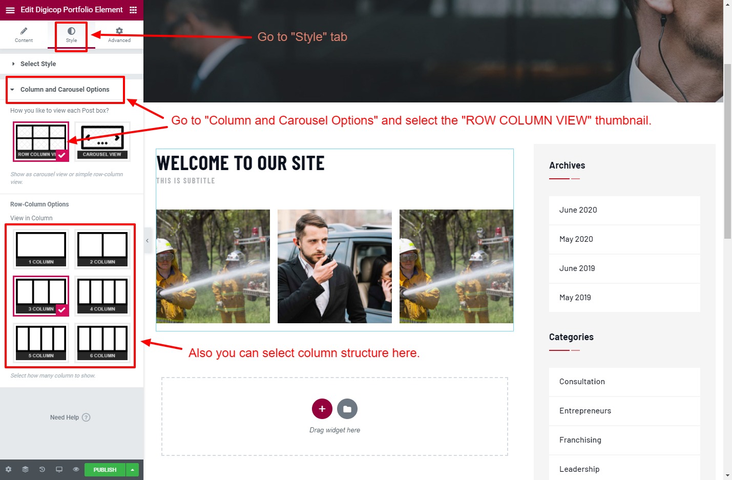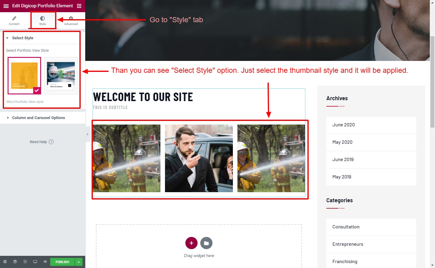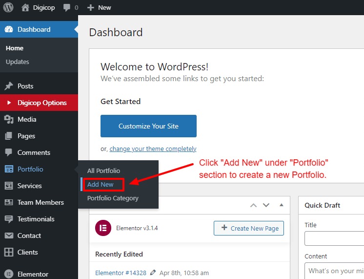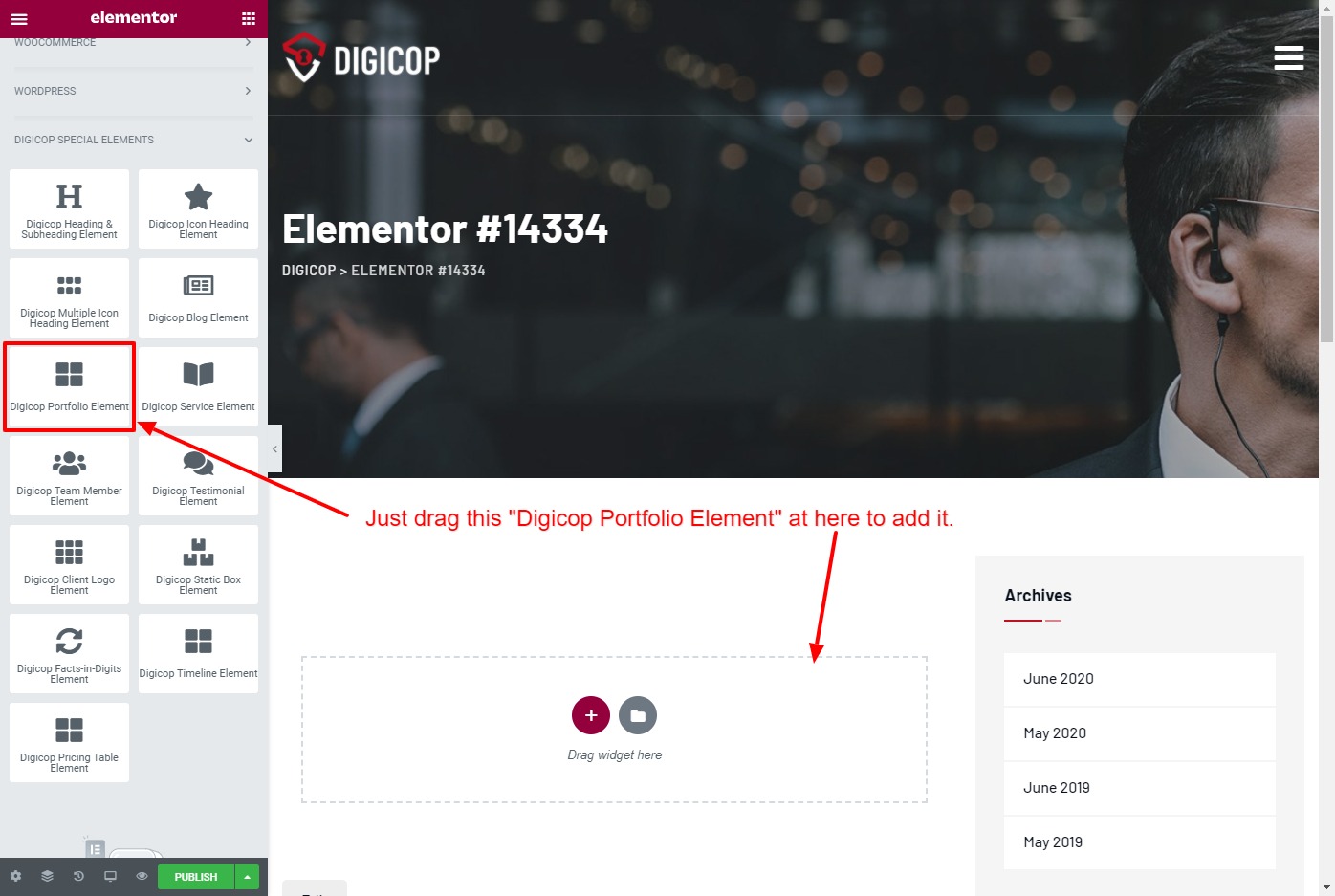 Now we have some Portfolio posts. So we can show all Portfolio on a page. Create a new page and add Digicop Portfolio Element on a page by dragging it.