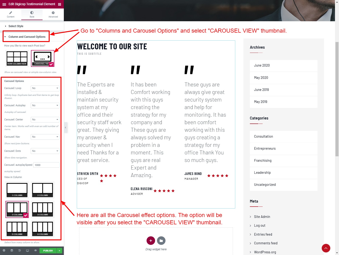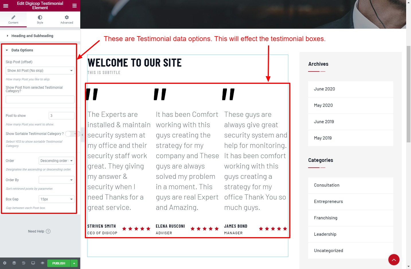 You can select the testimonial options here. Like how many testimonial you like to show, show testimonial from selected group (category), testimonial order etc.