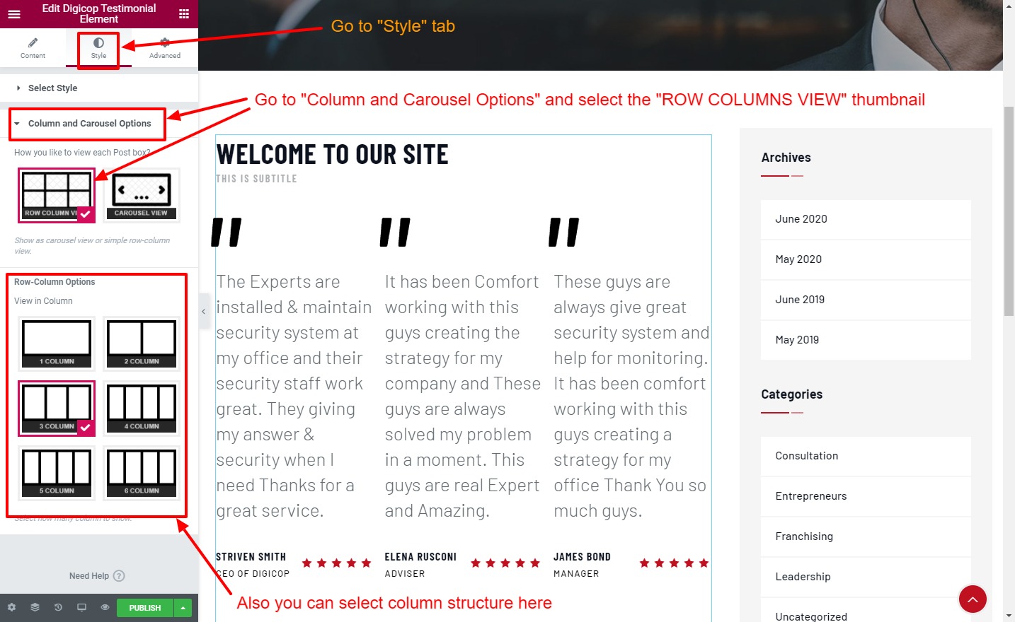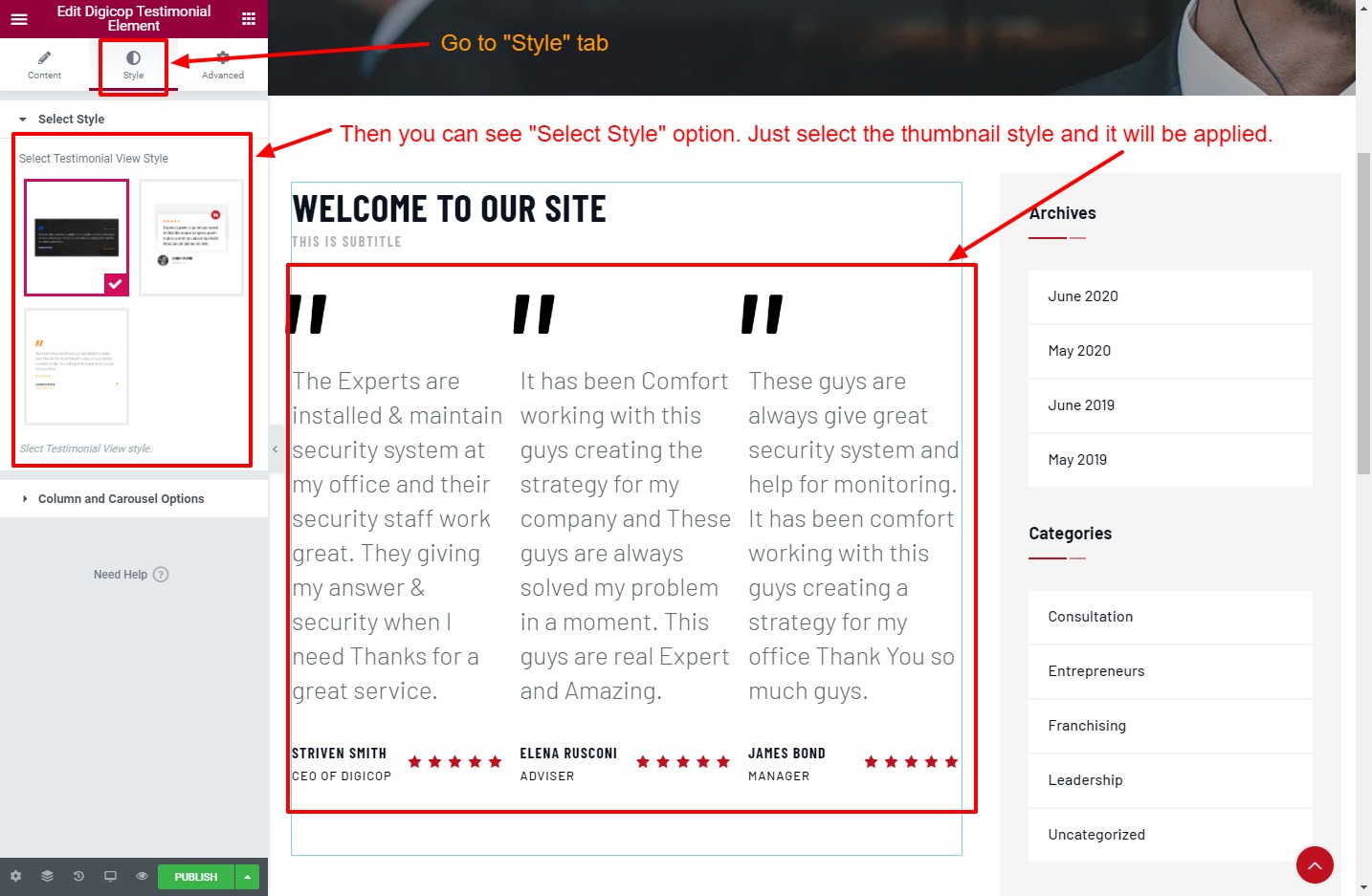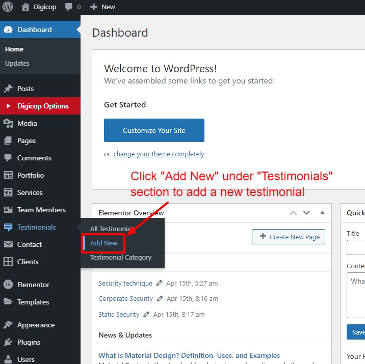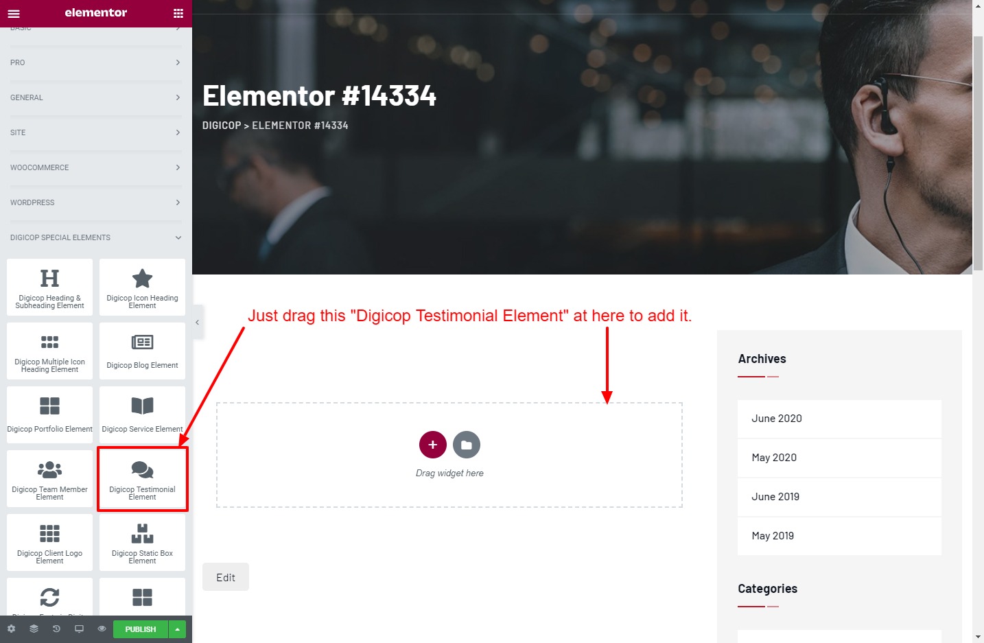 Now we have some Testimonial posts. So we can show all Testimonial on a page. Create a new page and add Digicop Testimonial Element on a page by dragging it.