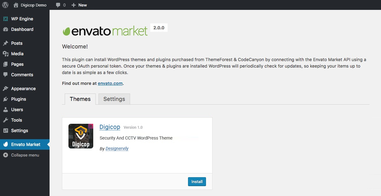 Once your token is saved and validated your page will refresh to show your Envato Market landing page with added tabs for your items. The added tab(s) display all of your theme and plugin purchases as well as their version numbers and quick links to the theme and author pages. So now you can install theme and also update theme in just one click.