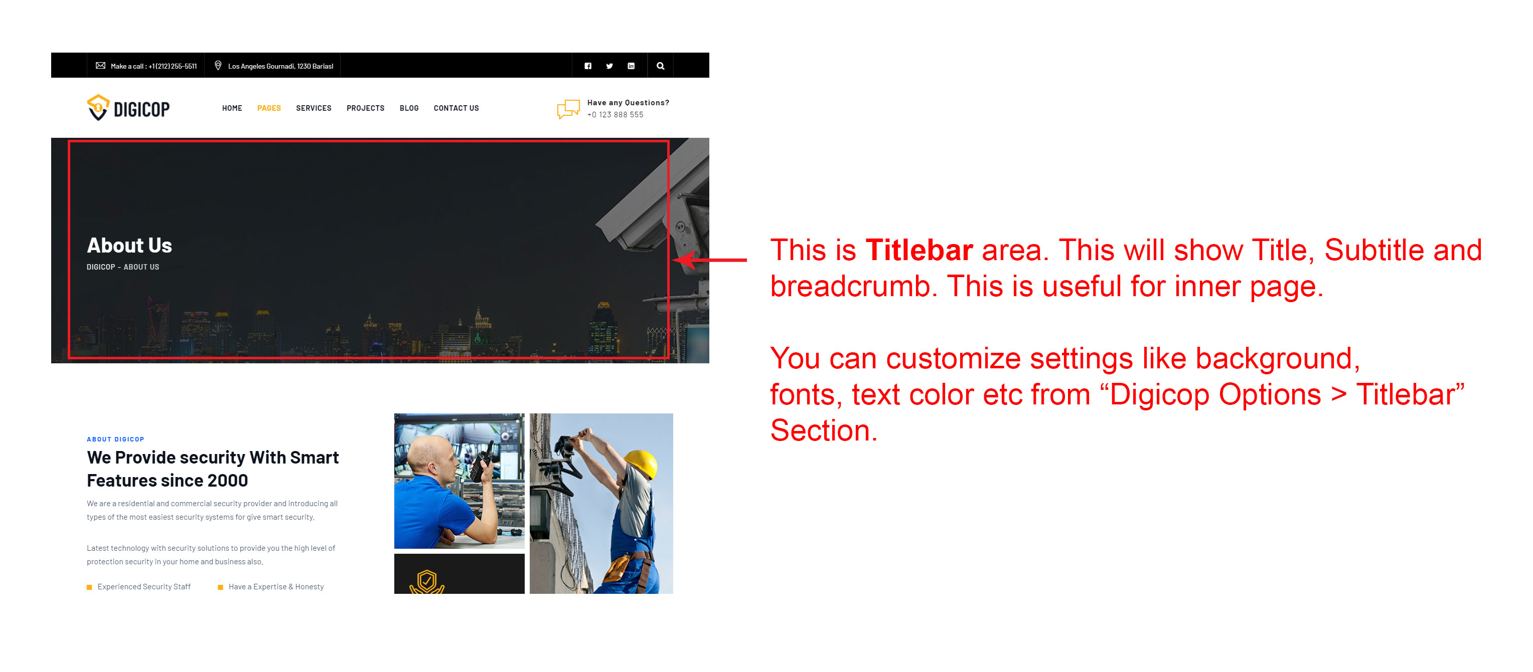 Generally the Titlebar will appear on inner page. This will appear below header area. This will show page title, subtitle and breadcrumb. (Where is Titlebar?)