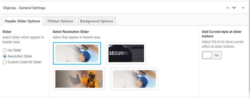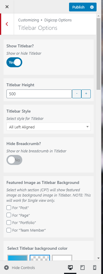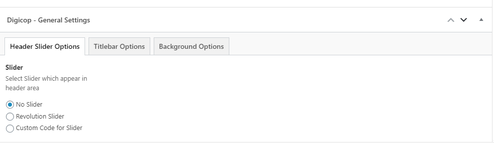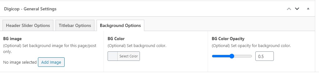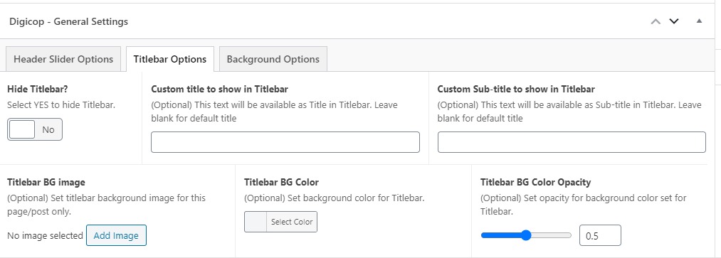 This will override the options set under Digicop Options > Titlebar Settings options. This will help you to set special design the Titlebar on specific page or post.