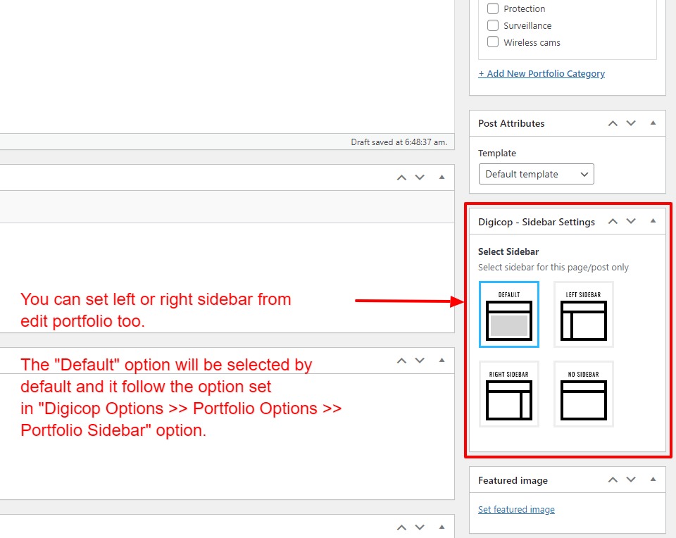 This is specially created sidebar postion for Portfolio single view only. You can select sidebar view (left or right) in Digicop Options >> Portfolio Options section. Also you can show single Portfolio without sidebar too.
