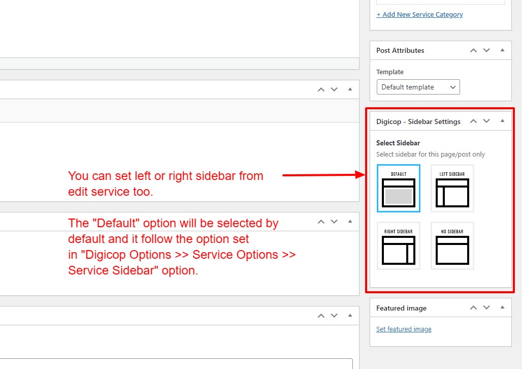 This is specially created sidebar postion for Service single view only. You can select sidebar view (left or right) in Digicop Options >> Service Options section. Also you can show single Service without sidebar too.