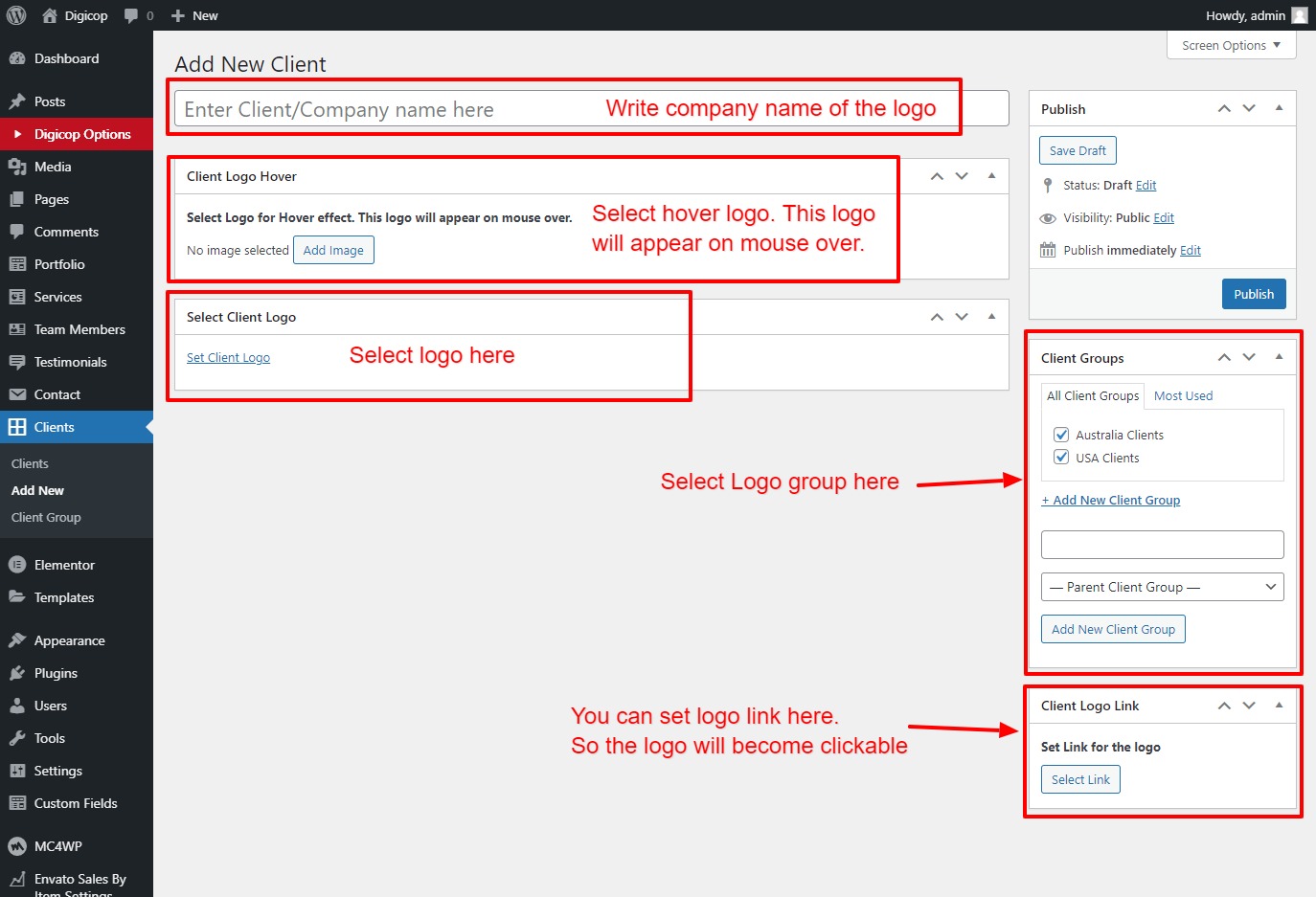 This will add a new logo. Repeat this steps and add some 3 or 6 client logo posts with the steps described above.