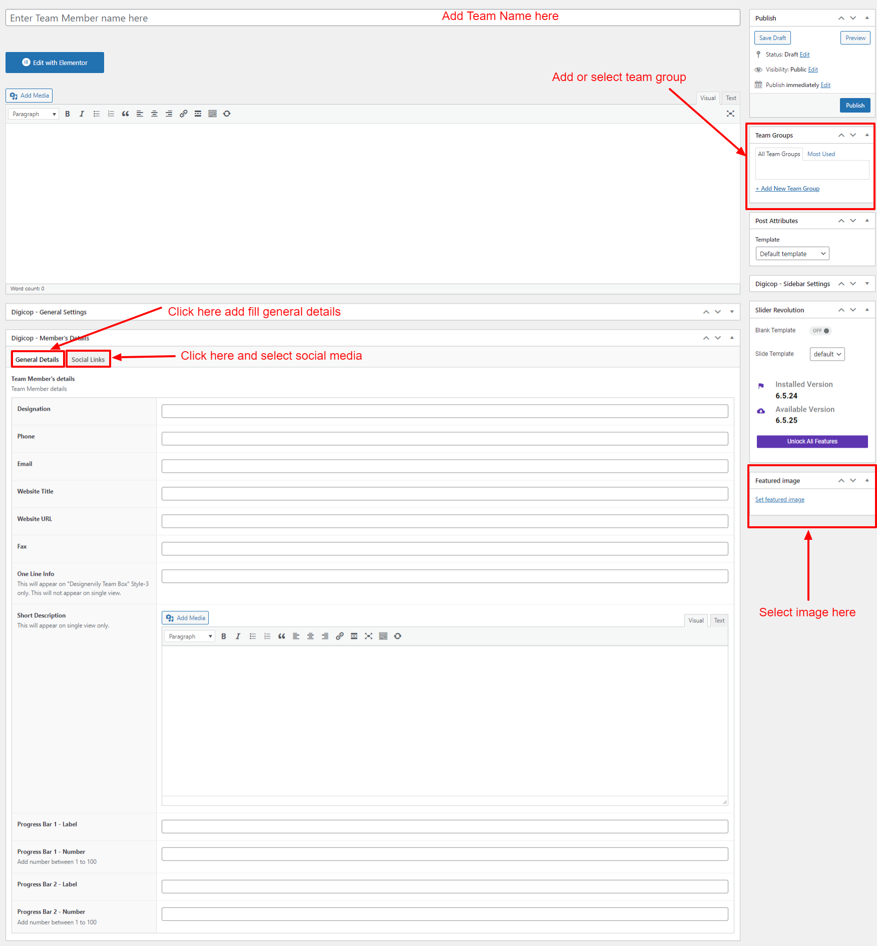 If you already done demo content setup than you can edit existing Team and check how we added data so you can understand each option perfectly.