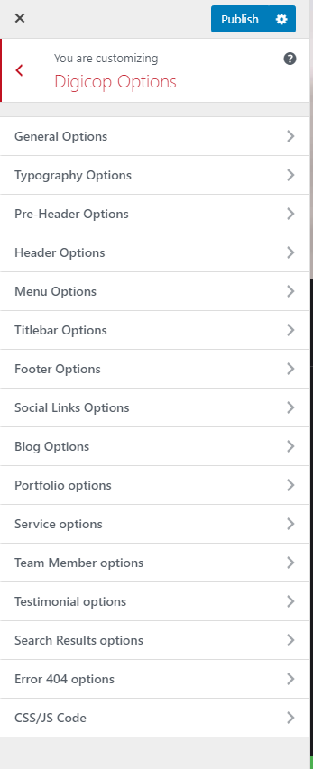 There are different sections in Digicop theme. Here you will find name of each section name so you can find their options easily. You can customize each sections from Digicop Options easily.