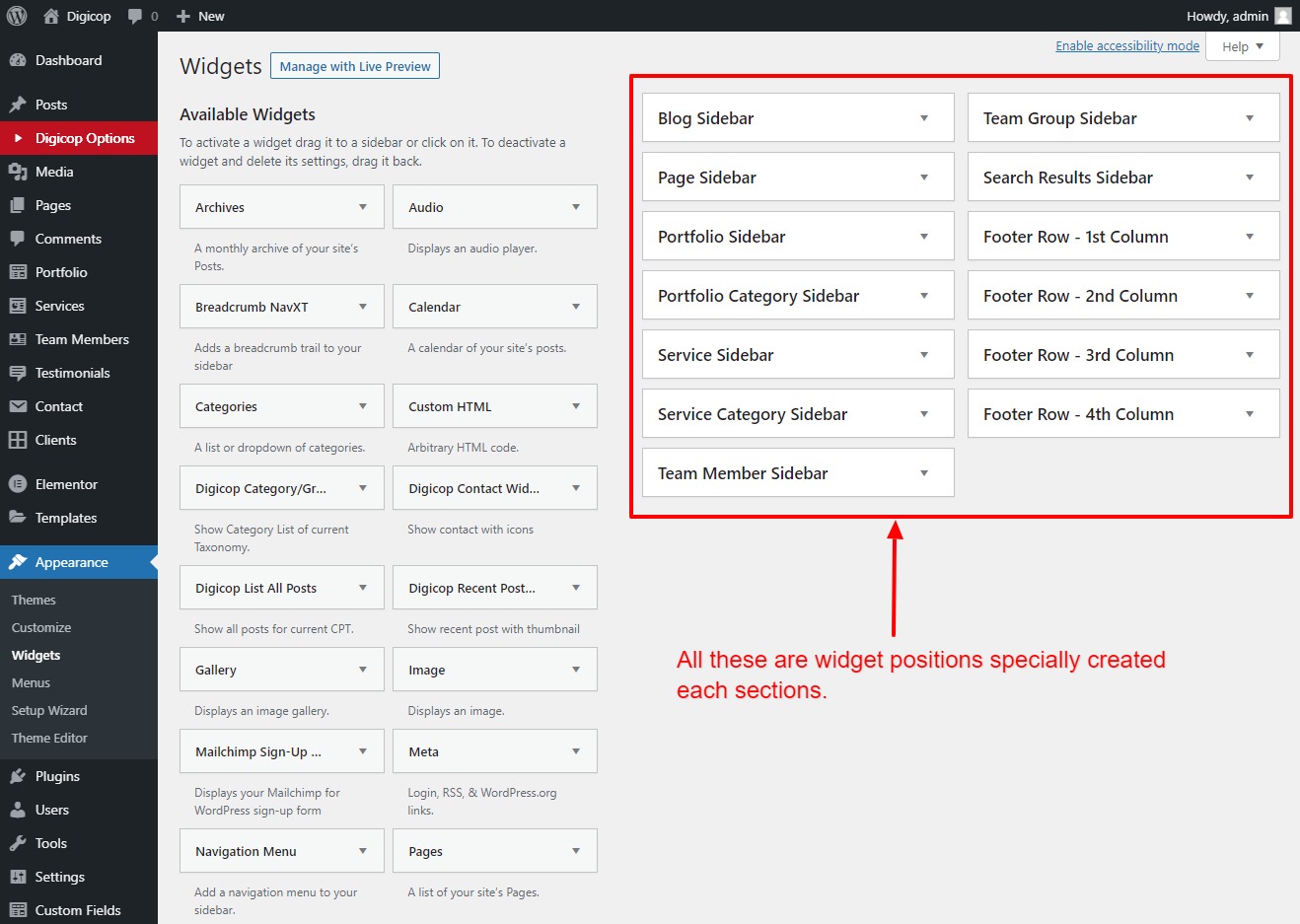 Digicop theme comes with widgets and different positions. We created special widget positions for each section so you can show sidebar and footer widgets properly according to content. Here are description of all widget positions: