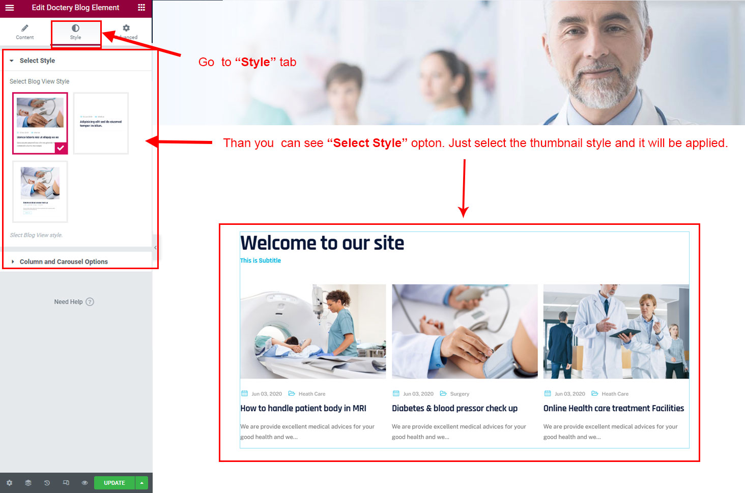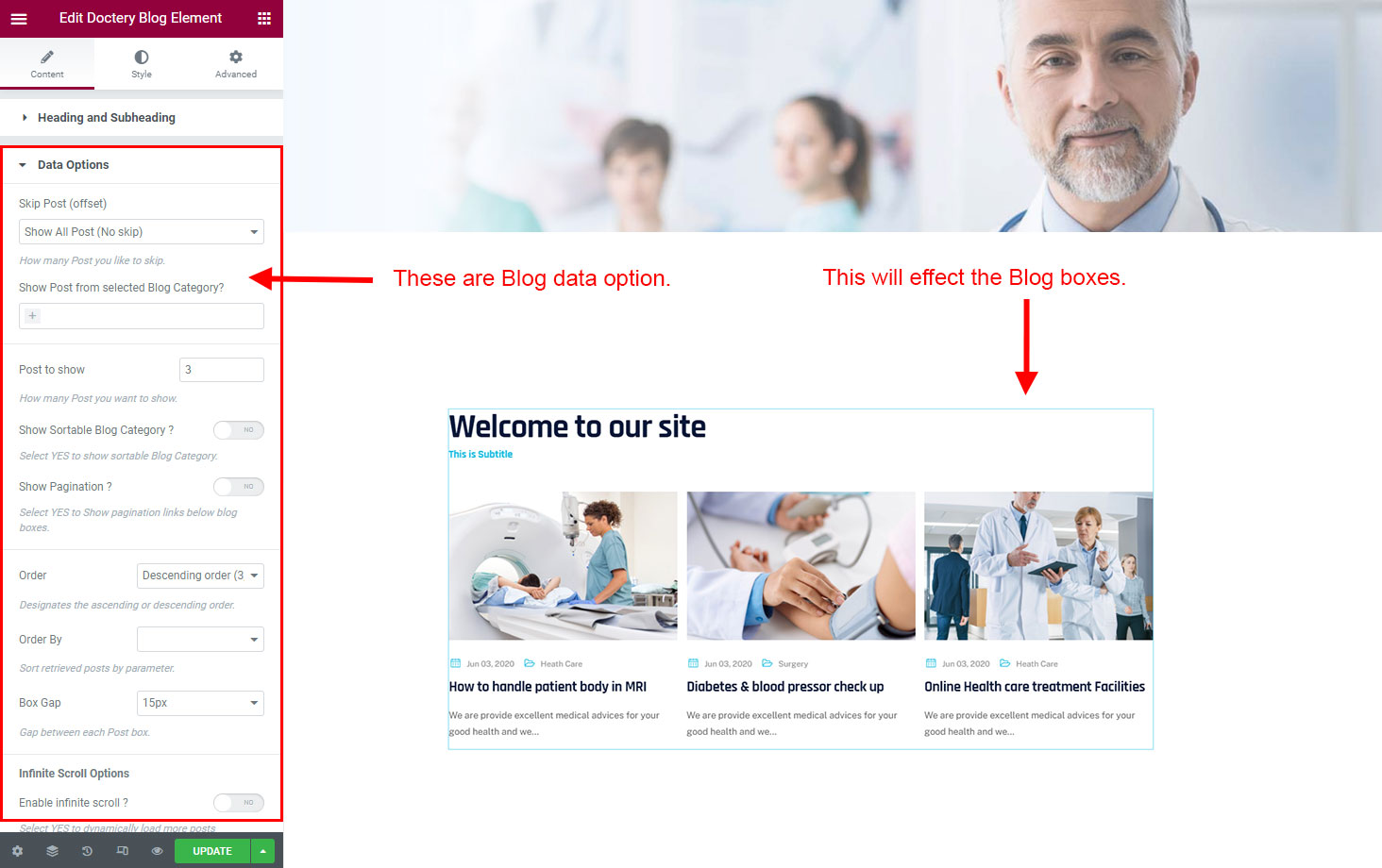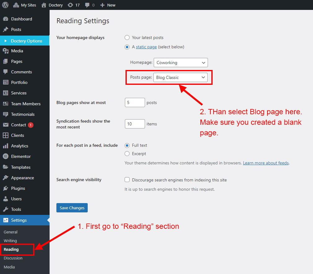 We created a Blog Element in Elementor Page Builder which you can use to show post on any page you want. Just drag and drop the Doctery Blog Element on any page and the post list will appear.