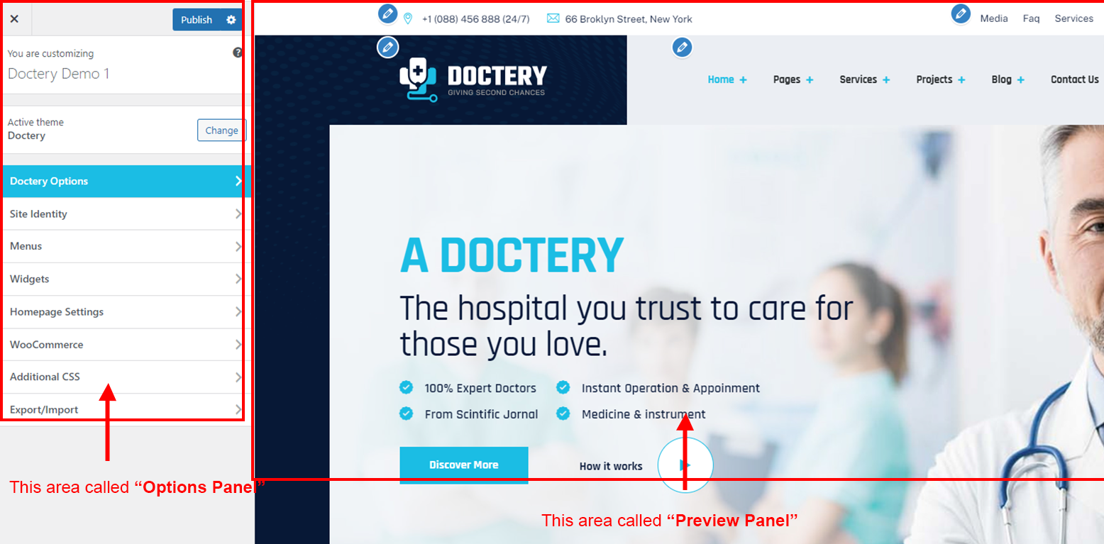 After clicking on the Doctery Options panel you will redirected to the Customize section. It has two sections. Left area called "Options Panel" and the right area called "Preview panel". See screenshot given below: