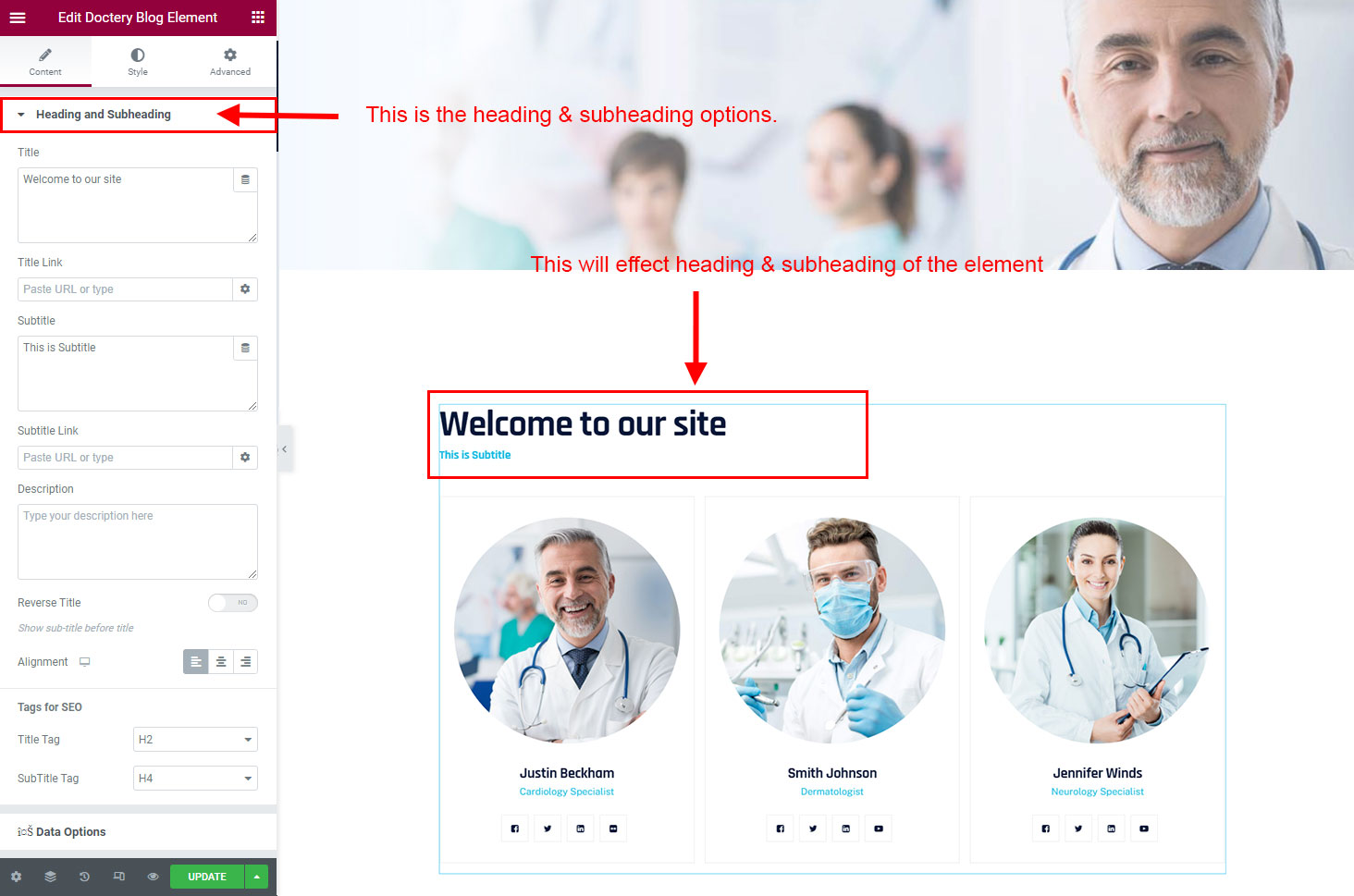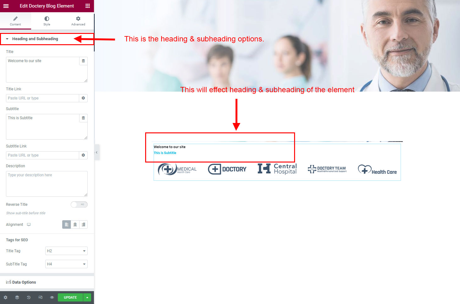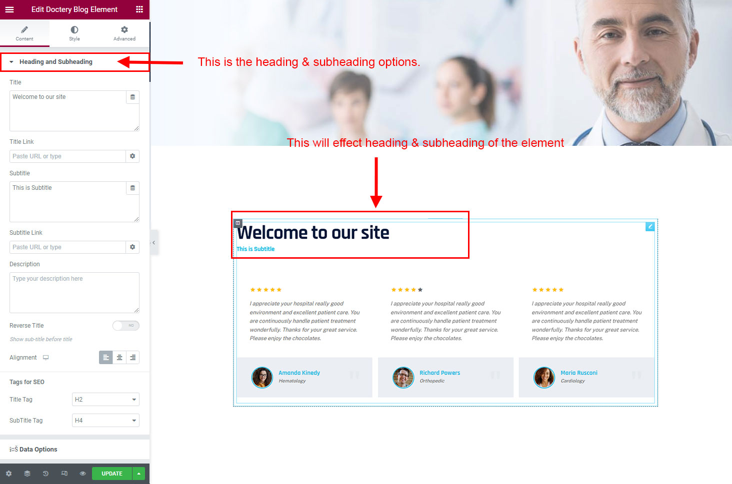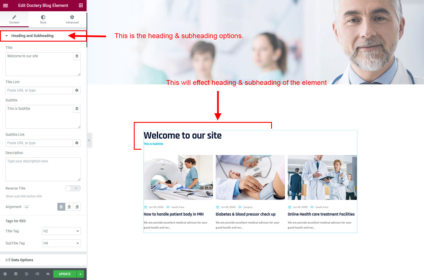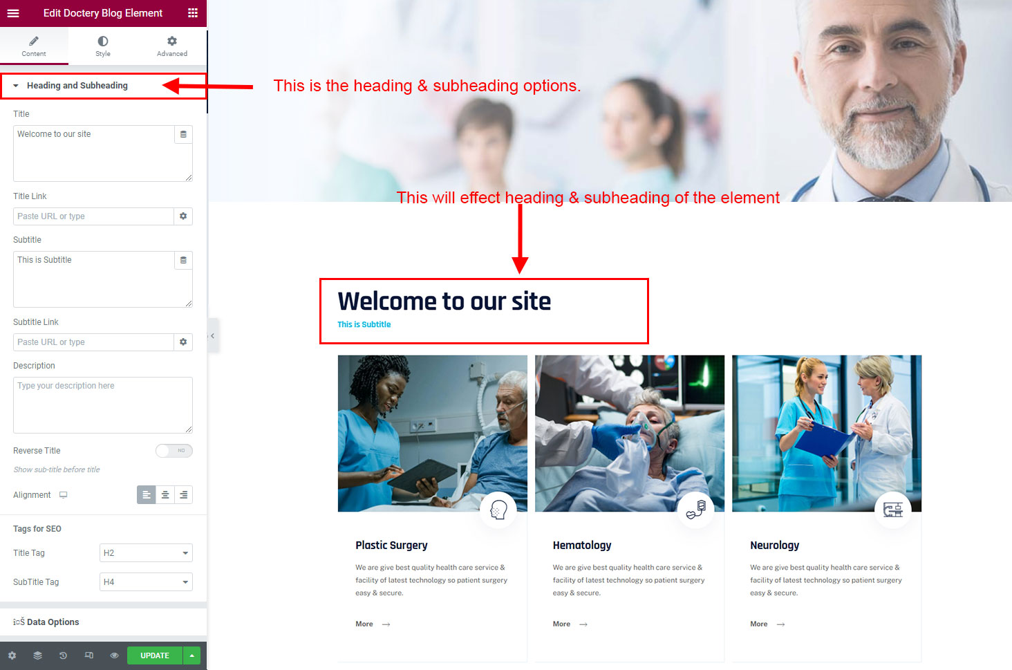 The heading and subheading will appear at top of the element. You can change text, add link to the heading or subheading, change alignment, change tag (for SEO purpose) etc.