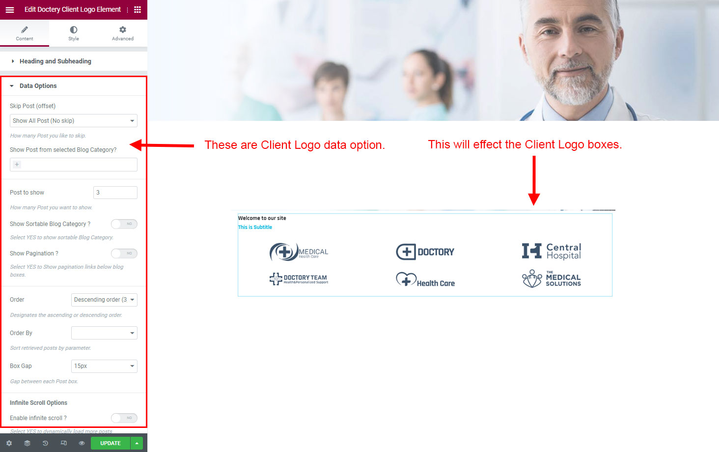You can select the client-logo options here. Like how many client-logo you like to show, show client-logo from selected group (category), client-logo order etc.