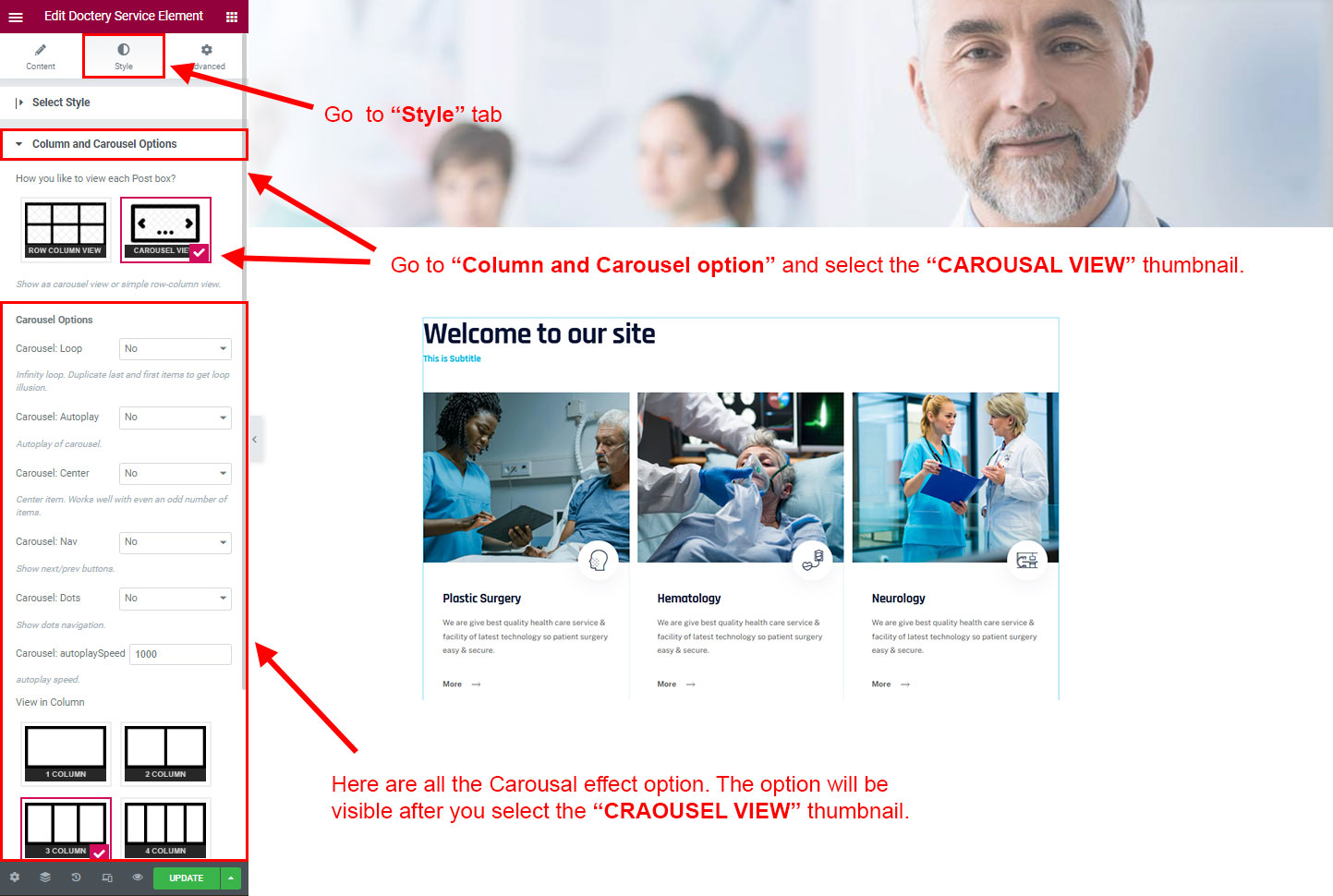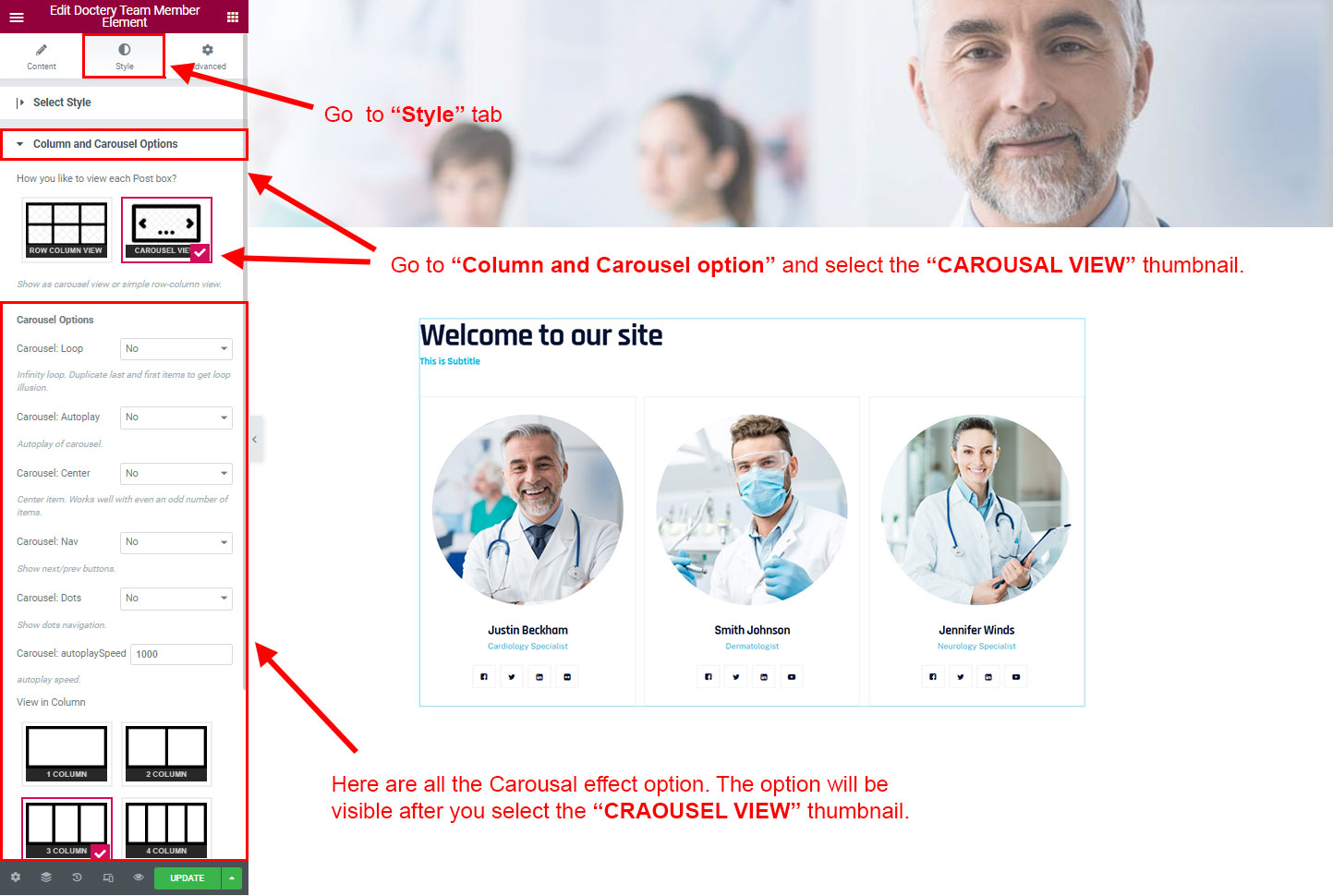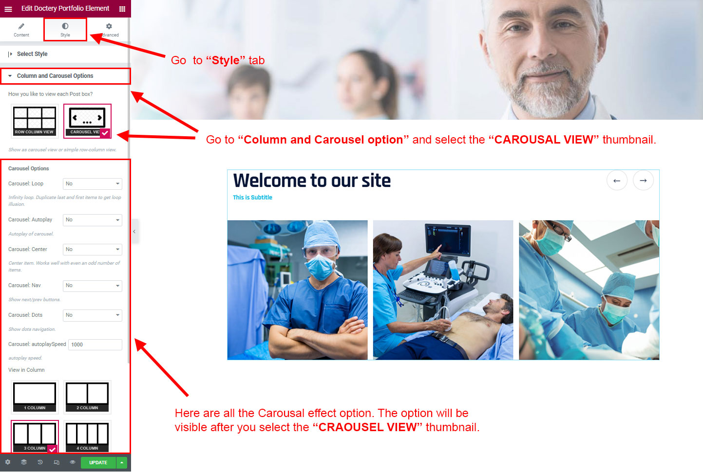 CAROSUEL VIEW: The Carousel view will be animated sliding view. There are lot's of options for the slideing animatins. Like animation speed, animation column, auto-play on or off, Loop post boxes, show/hide the dot or arrow navigation etc.