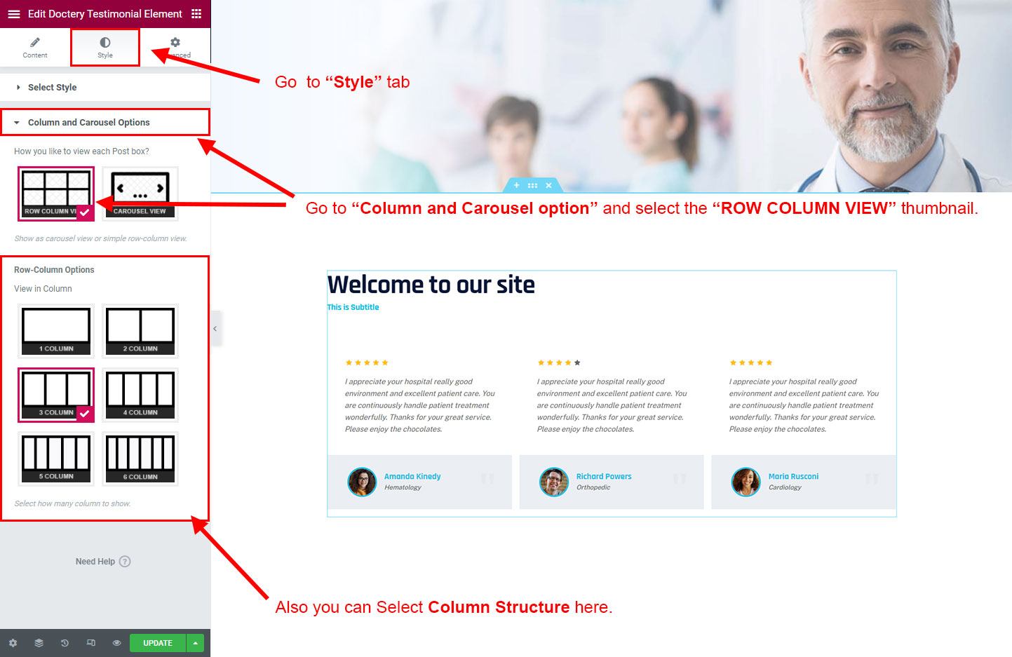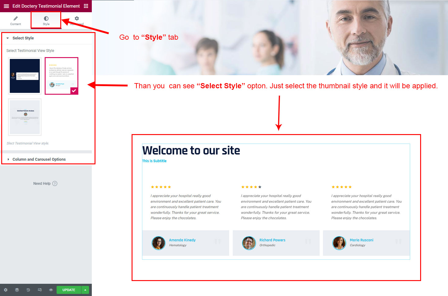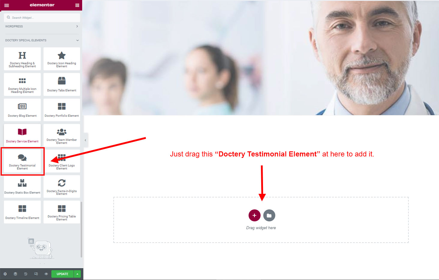 Now we have some Testimonial posts. So we can show all Testimonial on a page. Create a new page and add Doctery Testimonial Element on a page by dragging it.