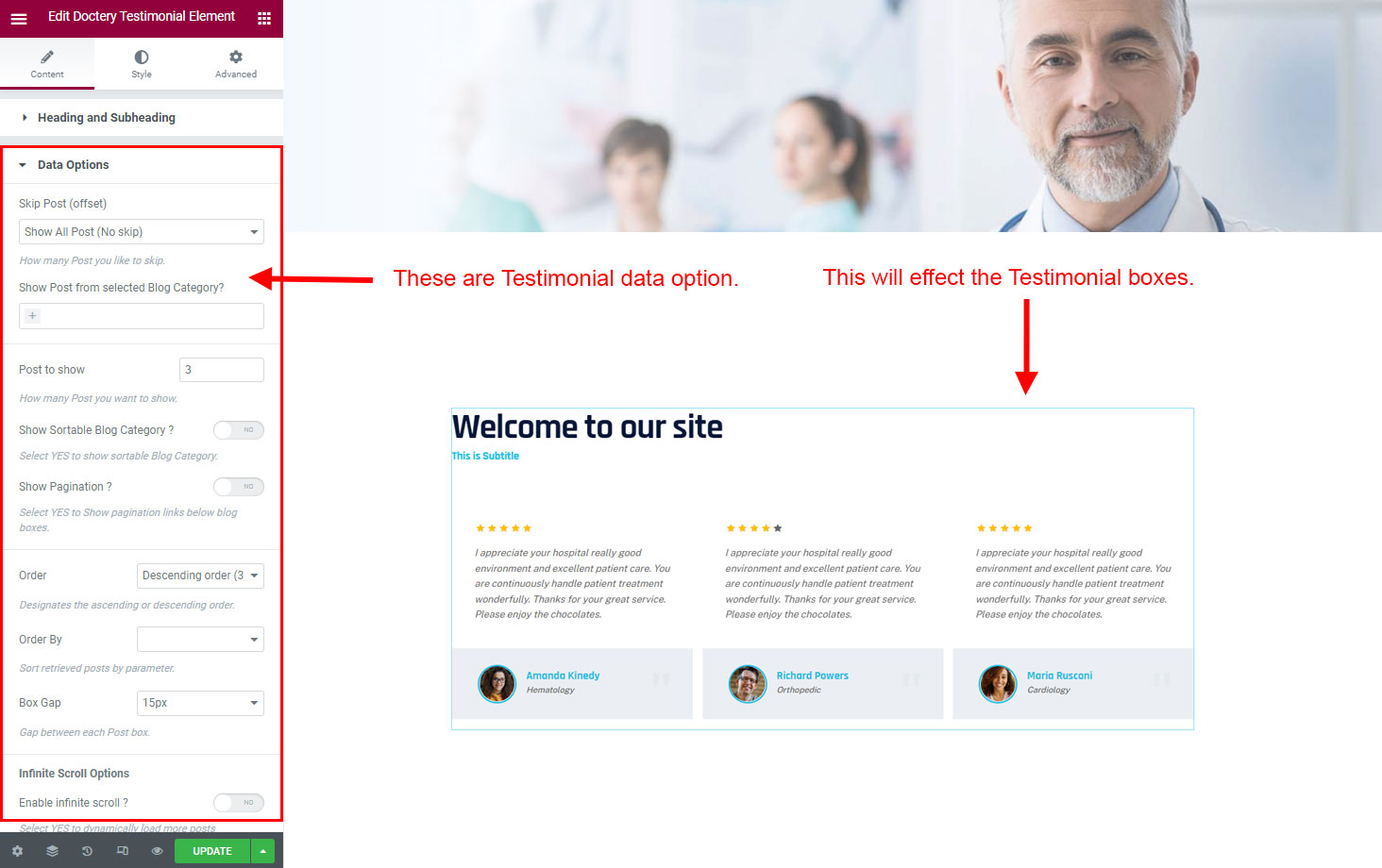 You can select the testimonial options here. Like how many testimonial you like to show, show testimonial from selected group (category), testimonial order etc.