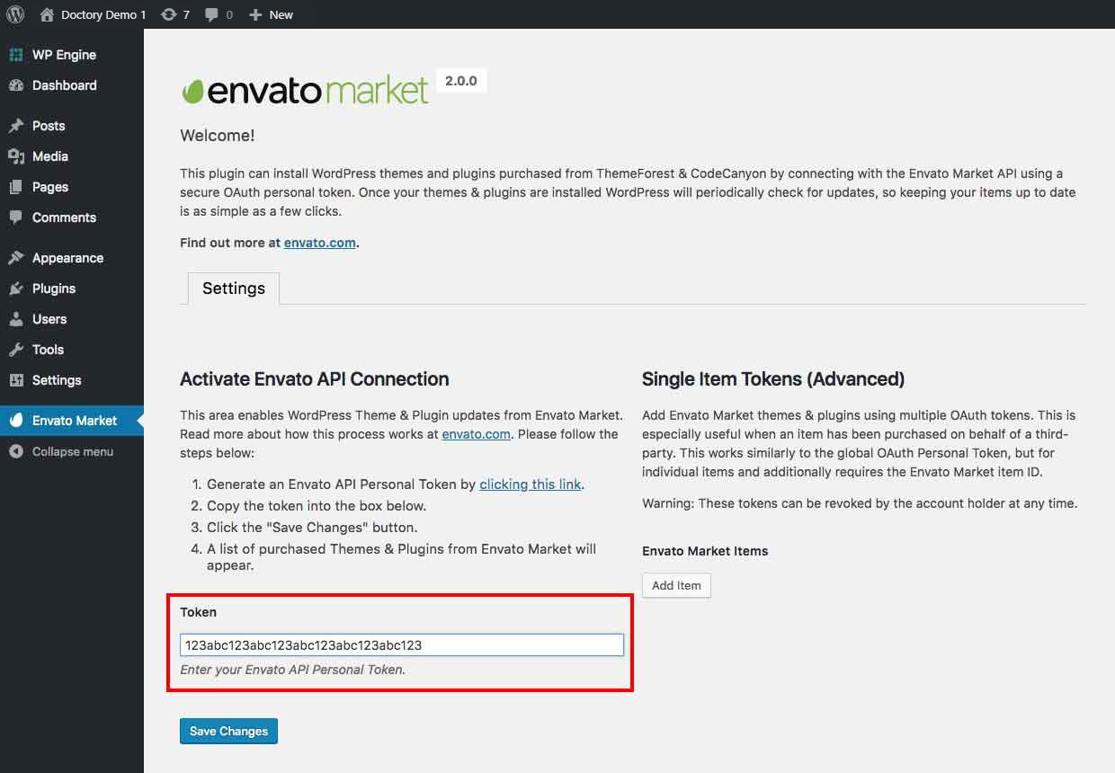 Now go back to your WordPress installation and paste in your Envato API token then click save.