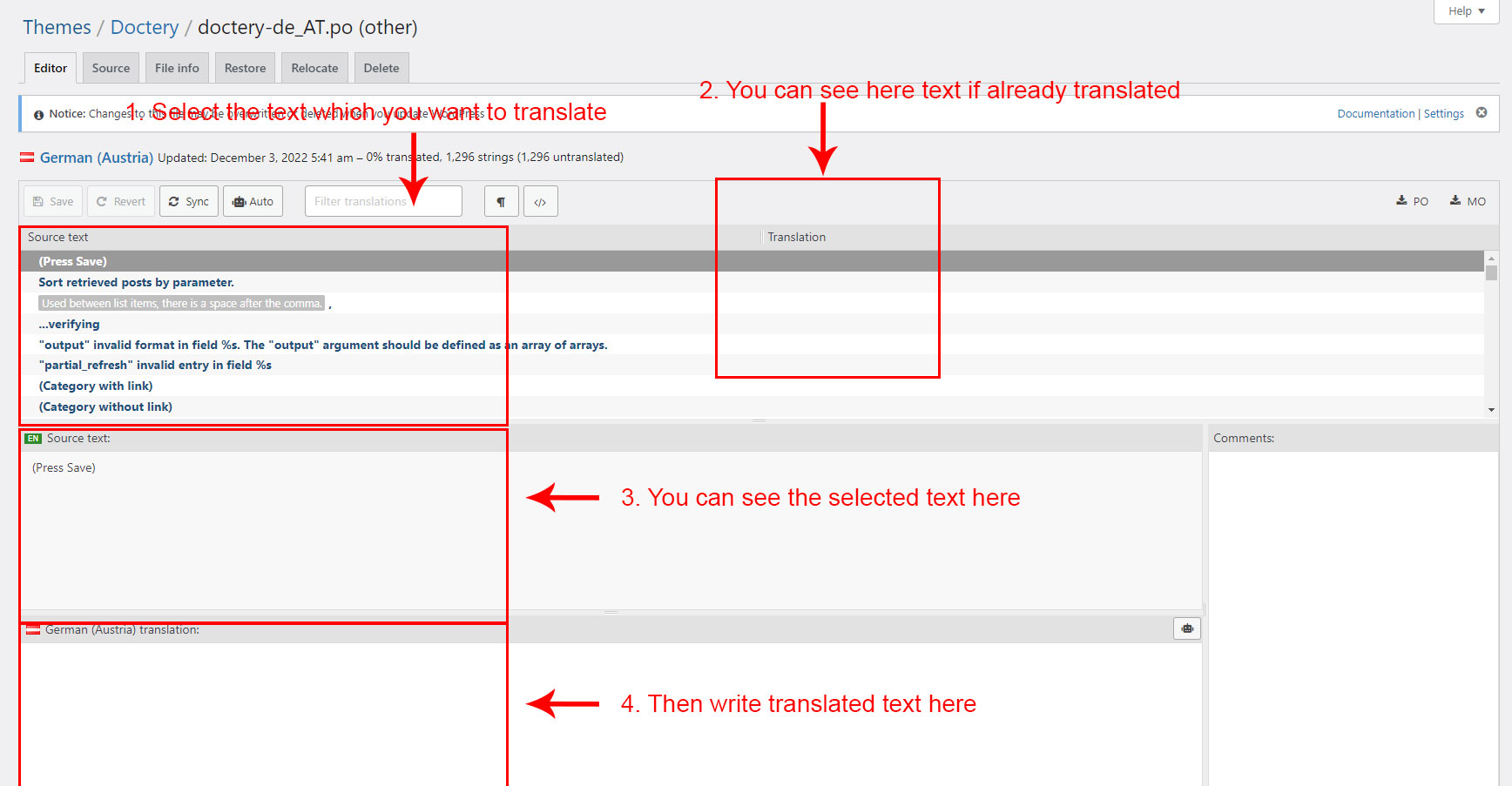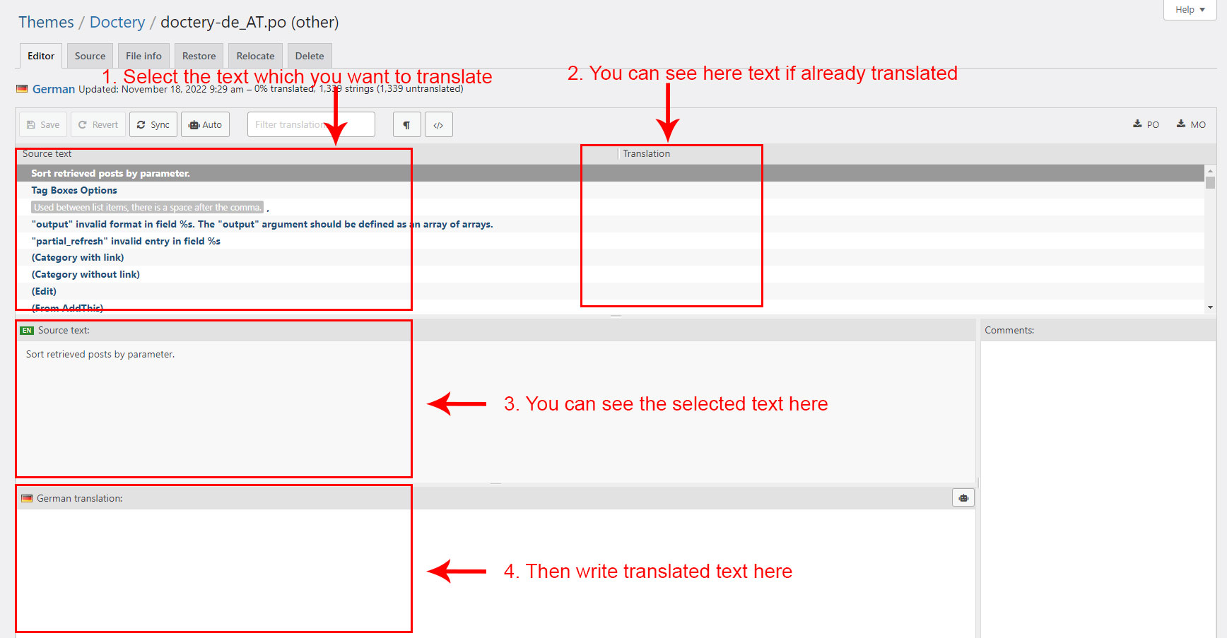 When you are done translating all the needed text strings into your desired language, save the file in /wp-content/languages/themes/ folder with language code in name. For example, if you were translating to the Deutsch language, you would save it as doctery-de_DE.po. The corresponding doctery-de_DE.mo file will be auto created by POEdit software.